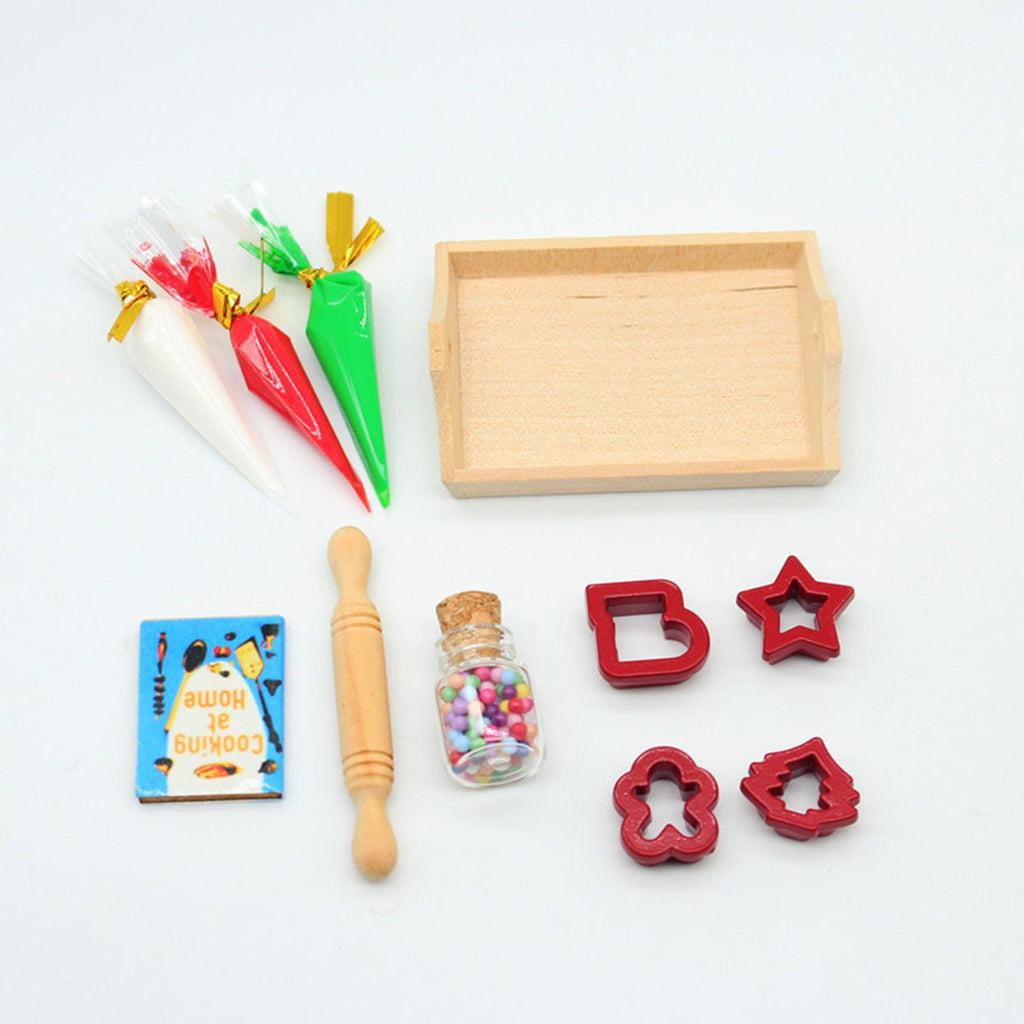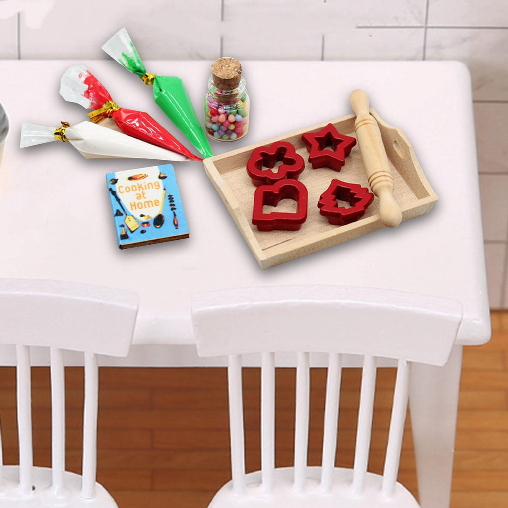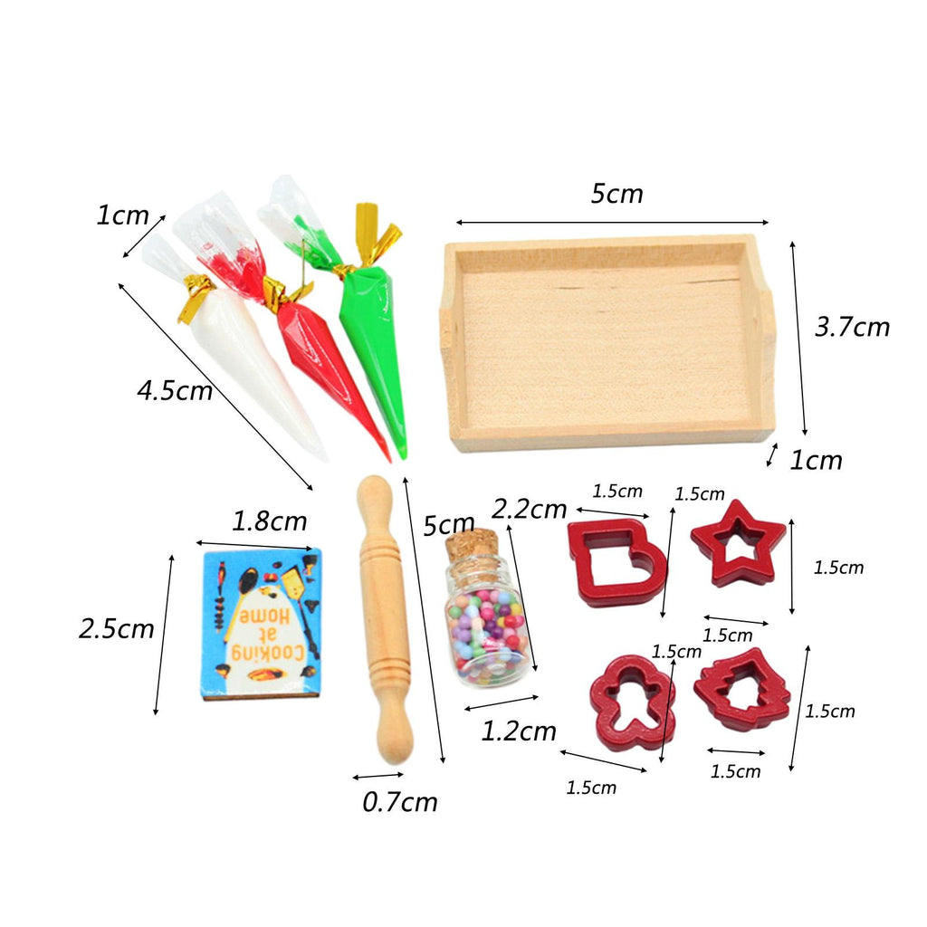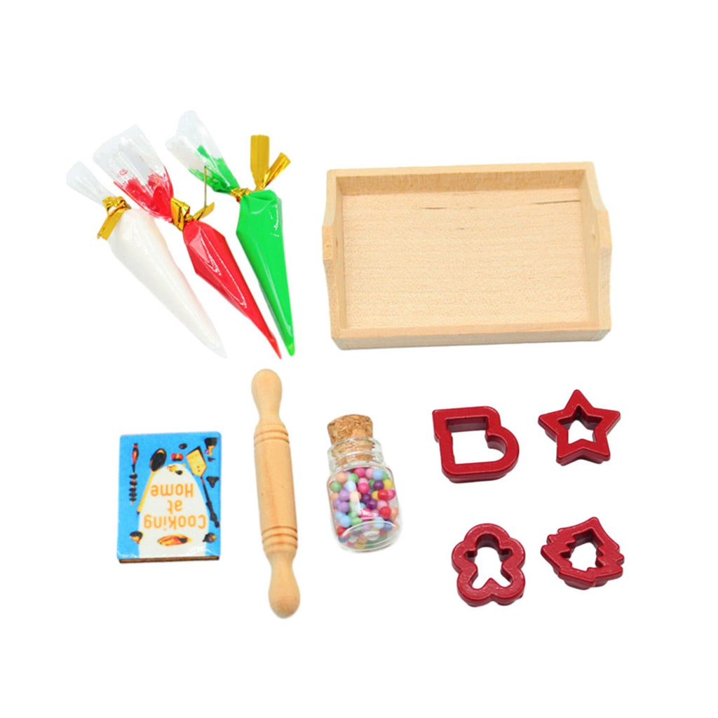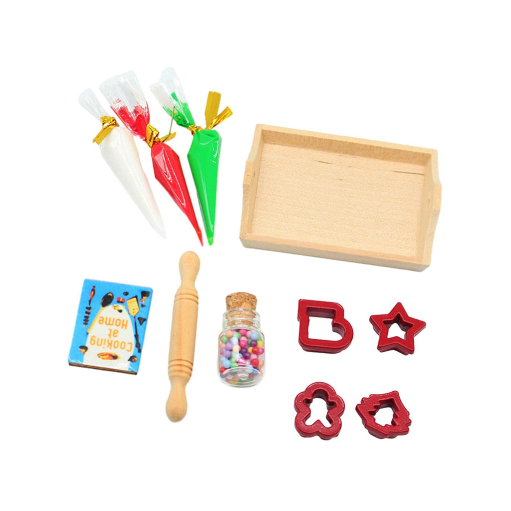 11 Dollhouse Baking Tools(include 1 tray, 4 cookies cutter, 1 rolling pin, 1 candy jar, 1 book, 3 cream)