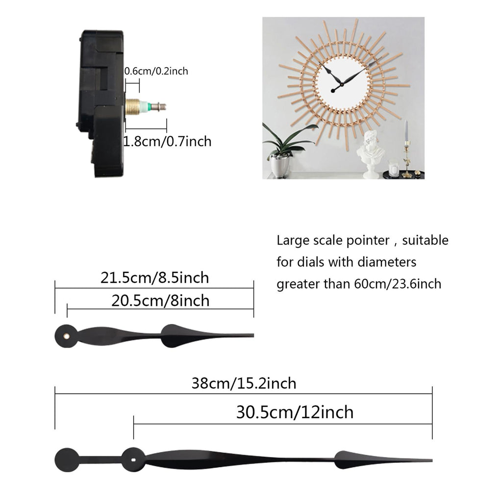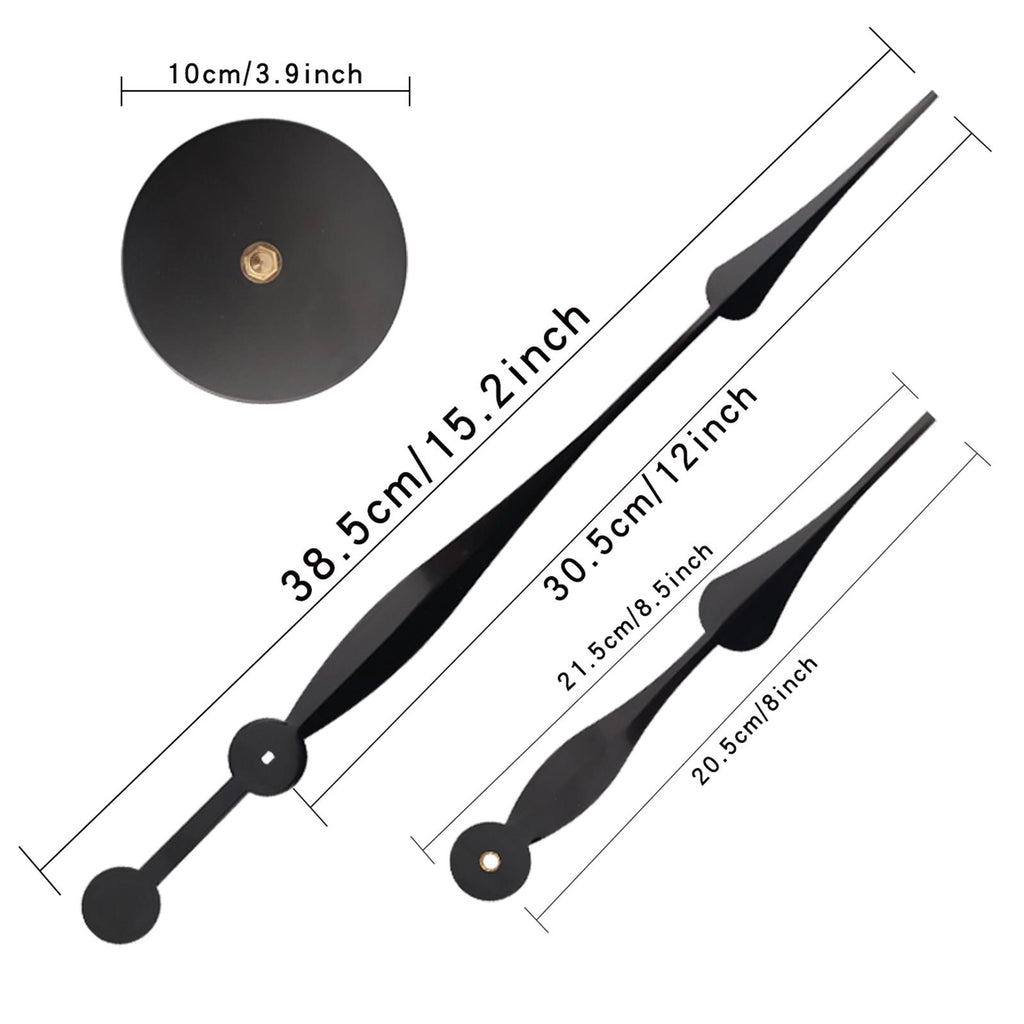 【Metal Hands】: The Long Shaft Replacement Clock Kit includes long metal hands measuring 30.5cm/12.01inch for the hour hand and 20.5cm/8.07inch for the minute hand from the center hole to the tip, providing a stylish and functional addition to your clock projects