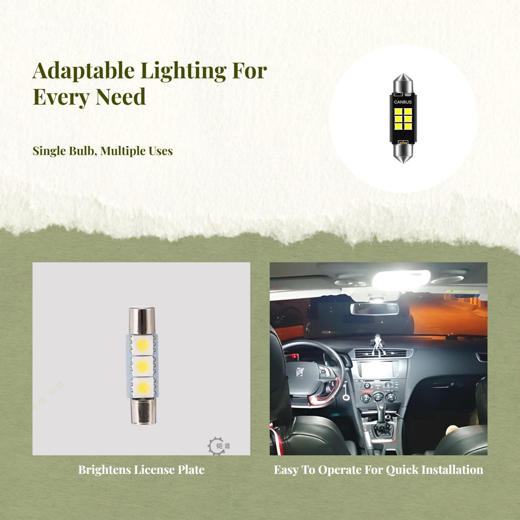 【Luminous light-emitting diode Dome Light for Car Interior】This 36mm light-emitting diode dome light provides enhanced lighting for your car interior, making it perfect for use as a task light, license plate bulb, or chart light.【Versatile Application for Multiple Scenarios】Suitable for dome, trunk, door, courtesy, and ceiling task light situations, this bulb improves visibility and convenience inside your vehicle.【Energy Saving and sturdy】With low power consumption and a long lifespan, this light-emitting diode bulb is both energy-efficient and dependable for common use.【Easy Plug-and-Play Installation】A direct replacement for traditional bulbs, this bulb features an easy plug-and-play design that is compatible with a wide range of vehicles.【High-Quality and Practical】Constructed from robust materials, this bulb delivers high performance and practicality for car owners seeking affordable lighting options.Specification: