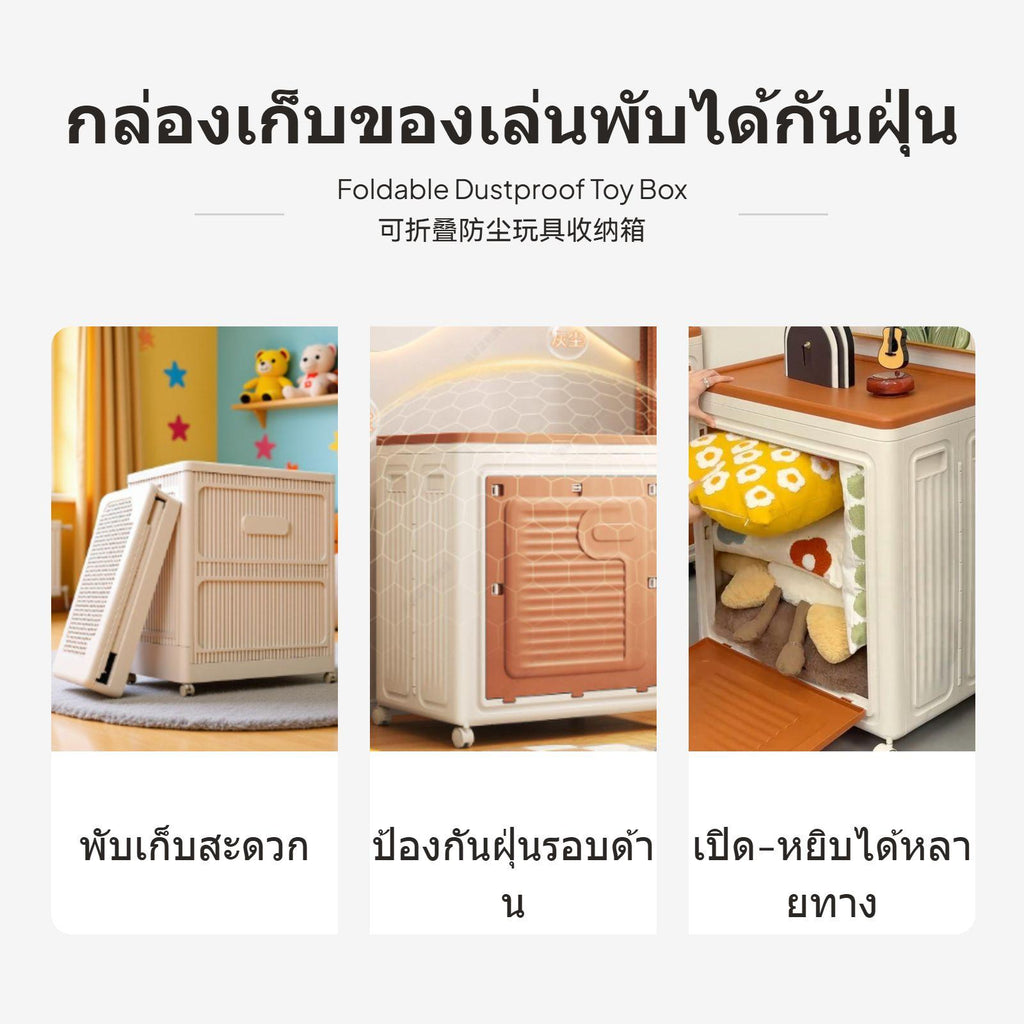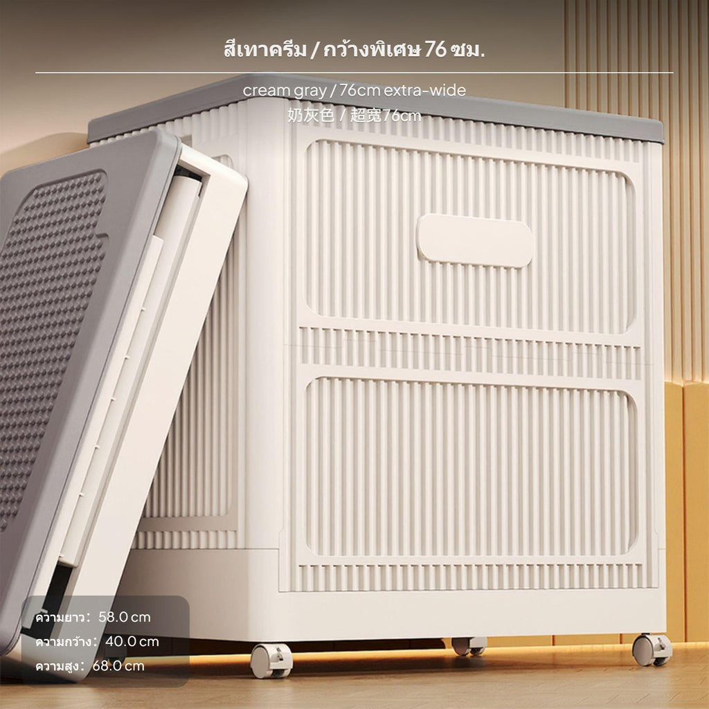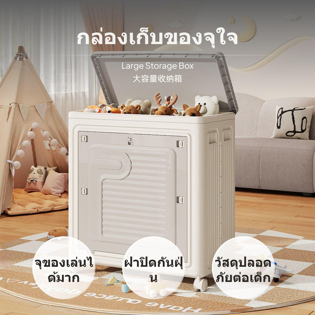 [Spacious superLarge Capacity] This 100L toy storage box is perfect for organizing plush toys and children's items, providing ample room to keep your child's belongings neat and tidy.[double-sided Opening Design for Convenience] Designed with a top flip lid and front door with a locking latch, making it easy to retrieve items from either side. The flip lid supports single-handed functionality for added convenience.[Portable and Space-Saving] Equipped with universal casters for easy mobility, and a foldable design that allows you to stow it away when not in use, saving valuable space in your home.[Stylish and Childchild-appropriate] Features a warm, cream gray finish with a modern aesthetic that blends seamlessly into any child's room. Its soft yet sturdy build ensures it is child-secure to handle.[Highly Protective and Hygienic] The fully enclosed dustproof design protects toys and other items inside, keeping the items clean, while the PP+HIPS material ensures enduring use with consistent reliability.Specification: