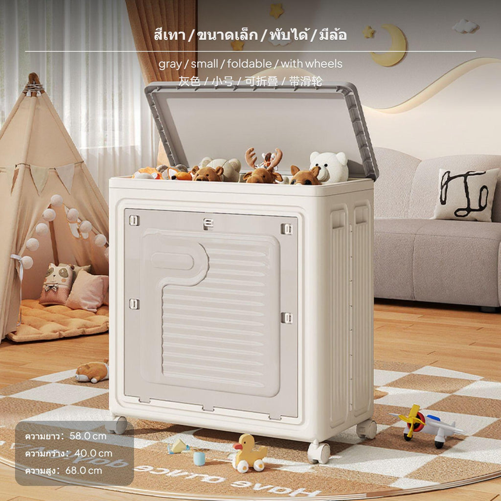 [Spacious superLarge Capacity] This 100L toy storage box is perfect for organizing plush toys and children's items, providing ample room to keep your child's belongings neat and tidy.[double-sided Opening Design for Convenience] Designed with a top flip lid and front door with a locking latch, making it easy to retrieve items from either side. The flip lid supports single-handed functionality for added convenience.[Portable and Space-Saving] Equipped with universal casters for easy mobility, and a foldable design that allows you to stow it away when not in use, saving valuable space in your home.[Stylish and Childchild-appropriate] Features a warm, cream gray finish with a modern aesthetic that blends seamlessly into any child's room. Its soft yet sturdy build ensures it is child-secure to handle.[Highly Protective and Hygienic] The fully enclosed dustproof design protects toys and other items inside, keeping the items clean, while the PP+HIPS material ensures enduring use with consistent reliability.Specification: