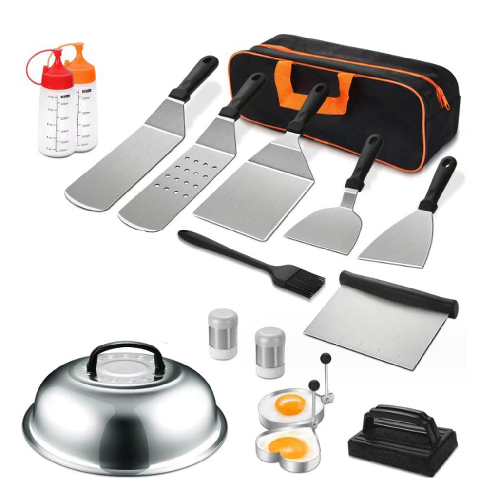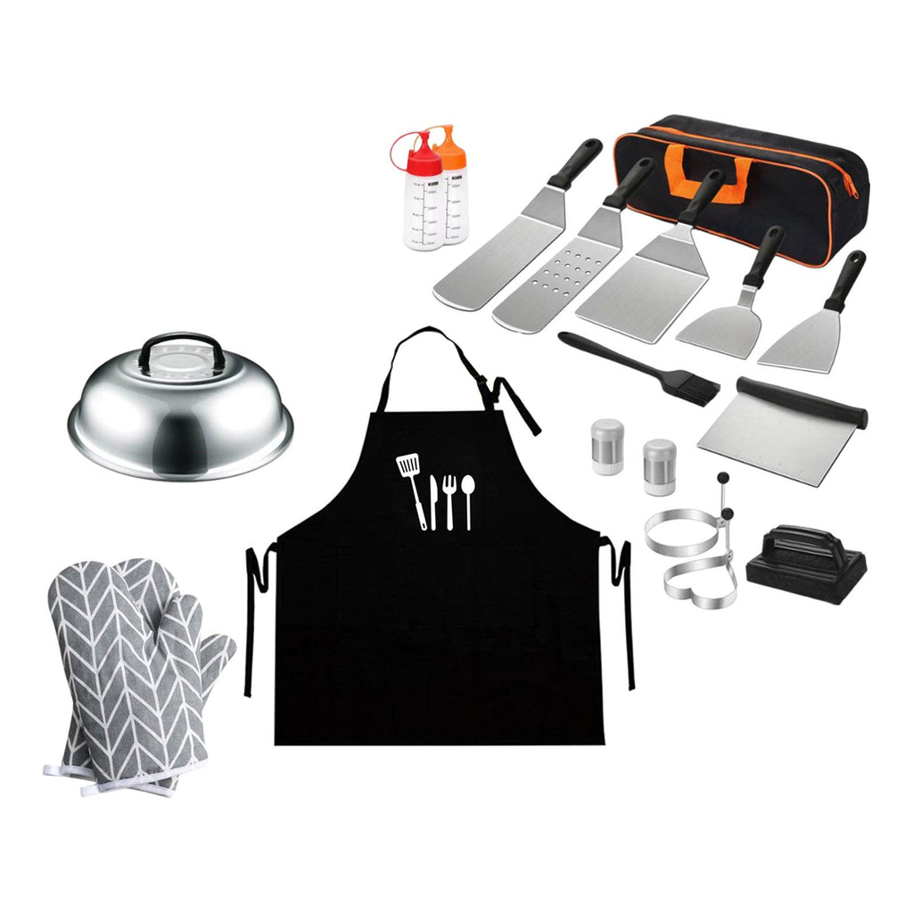 【Griddle Accessories】There are 1 Long Dense Spatula, 1 Long Drain Spatula, 1 Inclined Spatula, 1 Semi Circular Spatula, 1 Spatula, 1 Slotted Spatula, 1 Burger Press, 1 Cleaning Brush, 1 Basting Cover, 2 Eggs Cutting, 2 Bottles, 2 Spice Shakers, 1 Apron, 1 Carry Bag, 1 Pair Gloves in package.