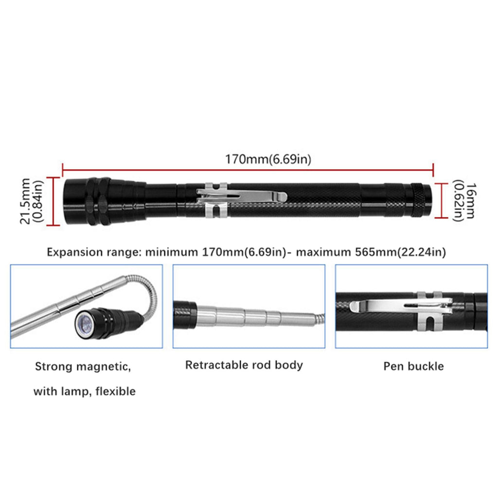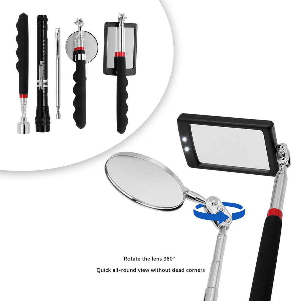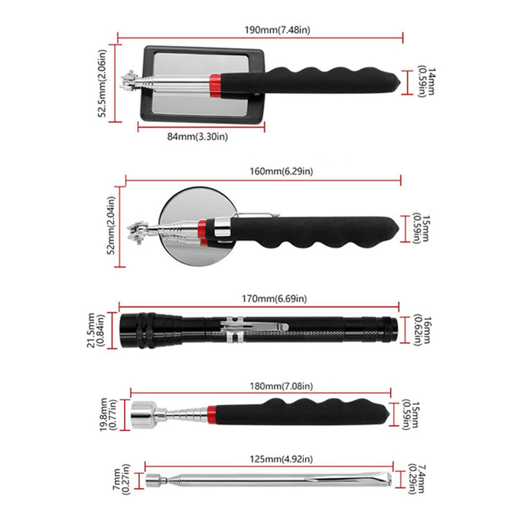 【5 Piece Telescoping Pickup Tool Set】: This set includes a 1lb telescoping pickup rod, a 15lb magnetic telescopic pickup rod, a 360° swivel square and round inspection mirror, and a magnetic telescoping flashlight. All tools are neatly packed in a box measuring 7.87inchx4.72inchx1.30inch.