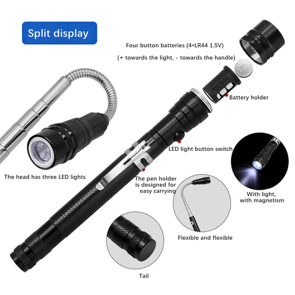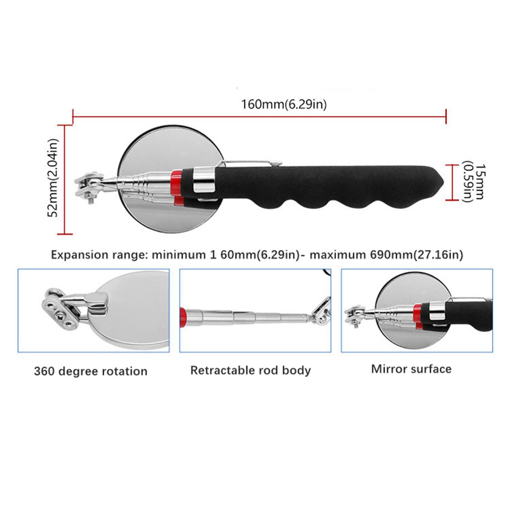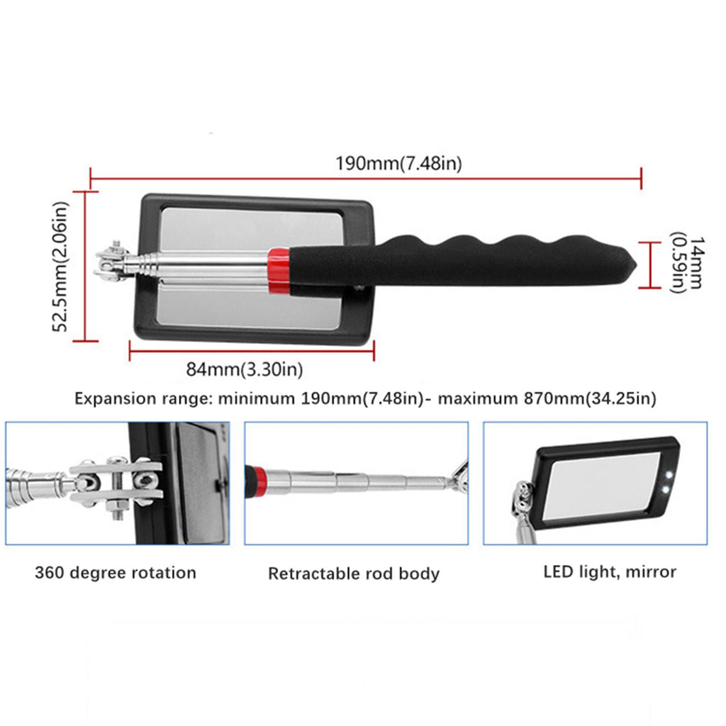 【5 Piece Telescoping Pickup Tool Set】: This set includes a 1lb telescoping pickup rod, a 15lb magnetic telescopic pickup rod, a 360° swivel square and round inspection mirror, and a magnetic telescoping flashlight. All tools are neatly packed in a box measuring 7.87inchx4.72inchx1.30inch.
