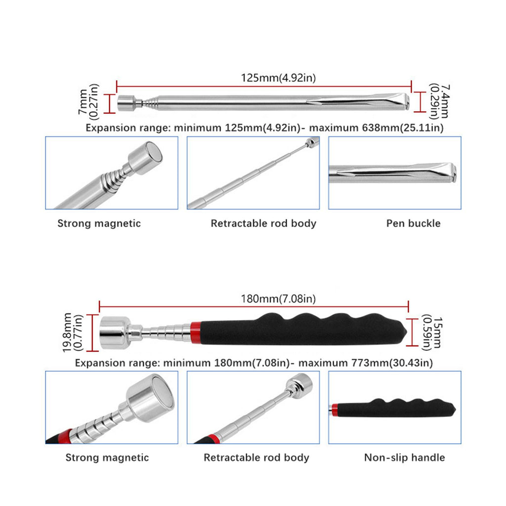 【Material】: These Magnetic Pick up Tools are made from stainless steel and aluminum alloy for durability and longevity. The handles are covered with PVC for comfortable grip.