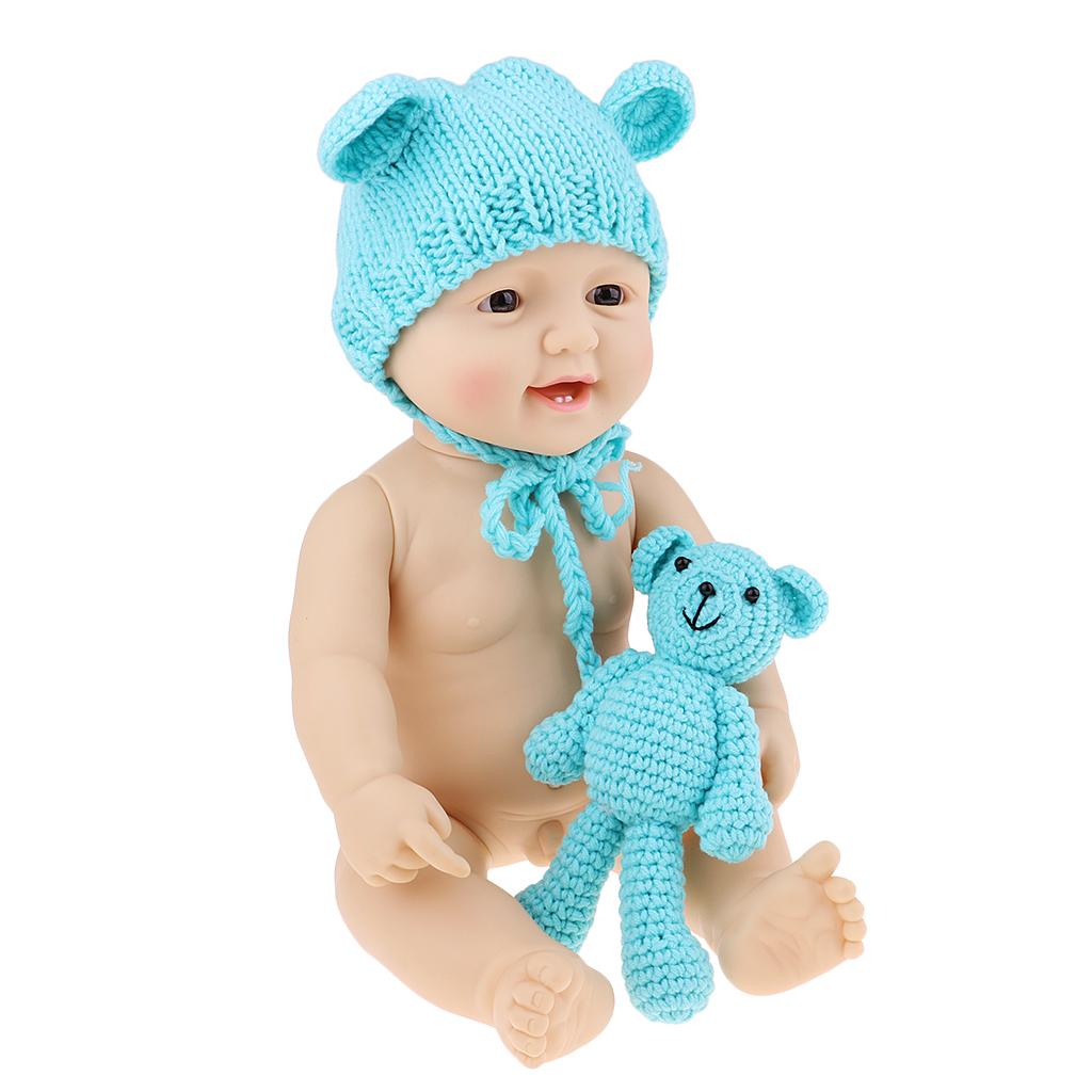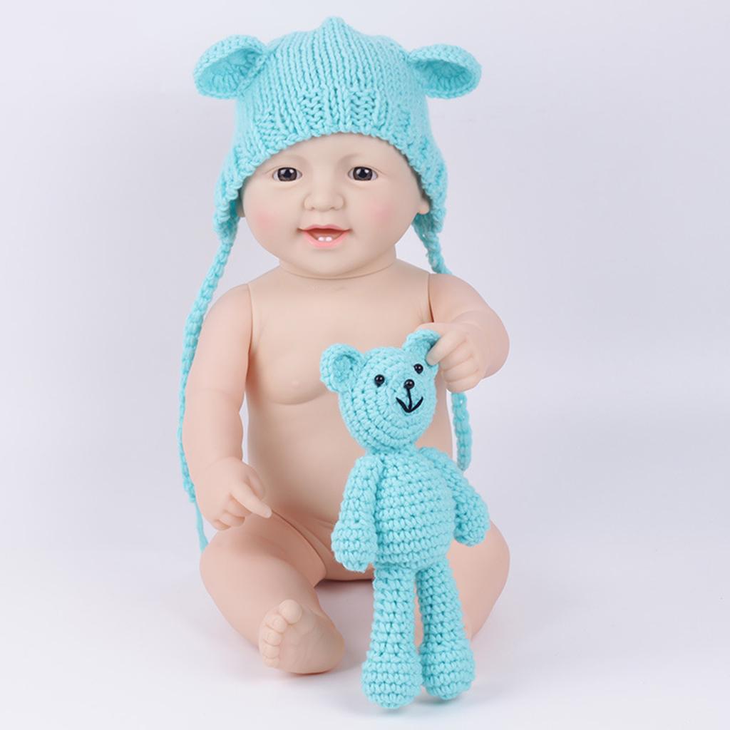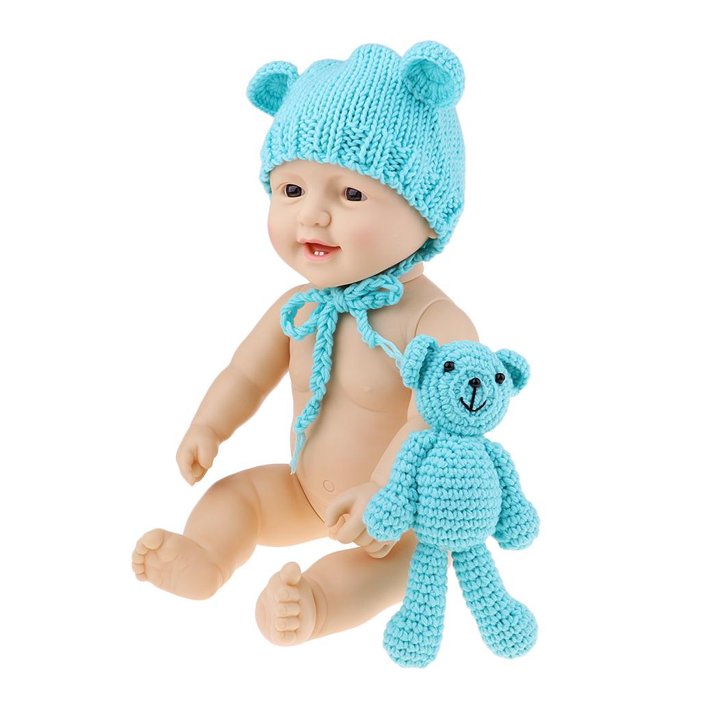 The doll with blue knitting hat(fits for 0-1 years old babys) and bear toy, features arms, legs and head are movable, can lie down and sit; can take a bath with your kids