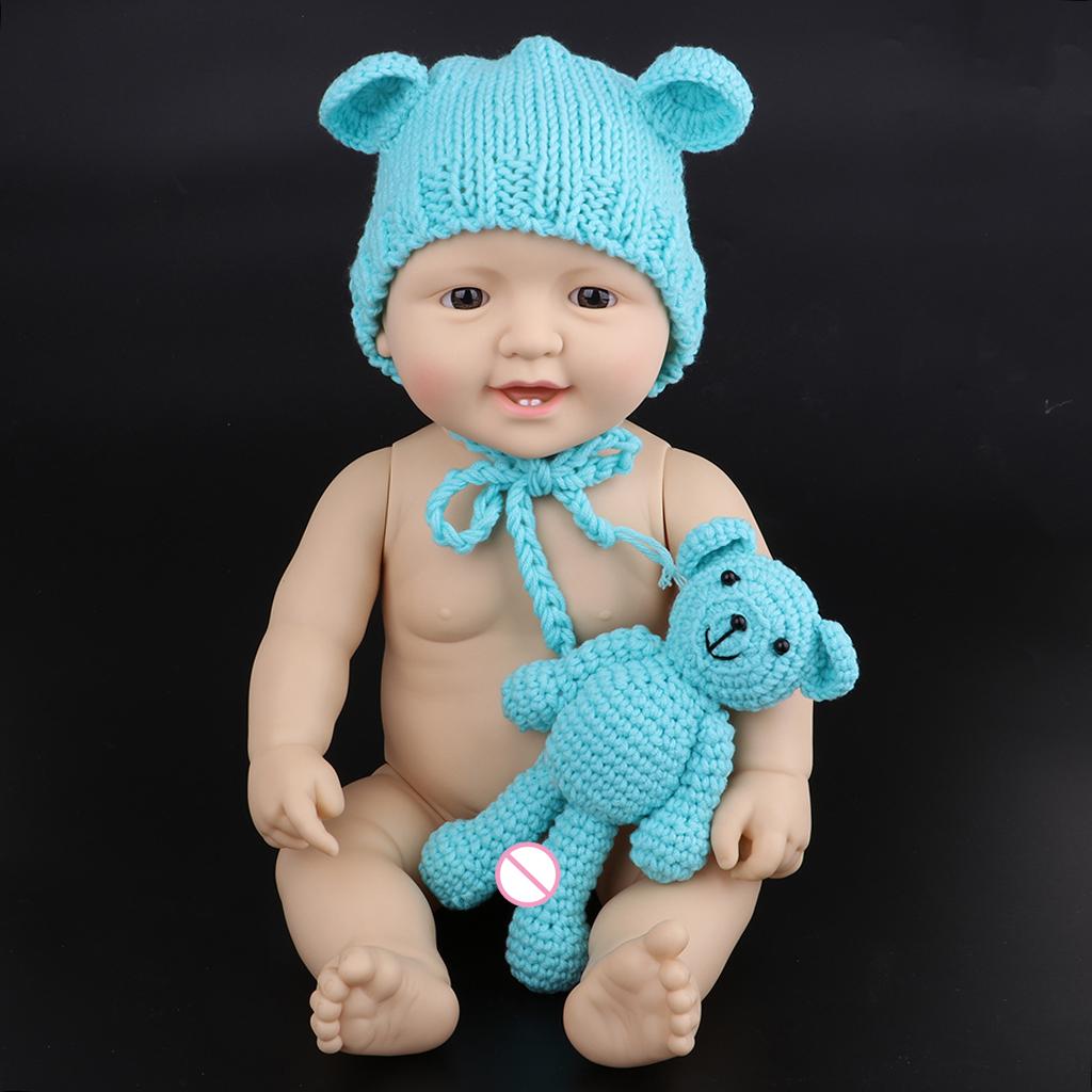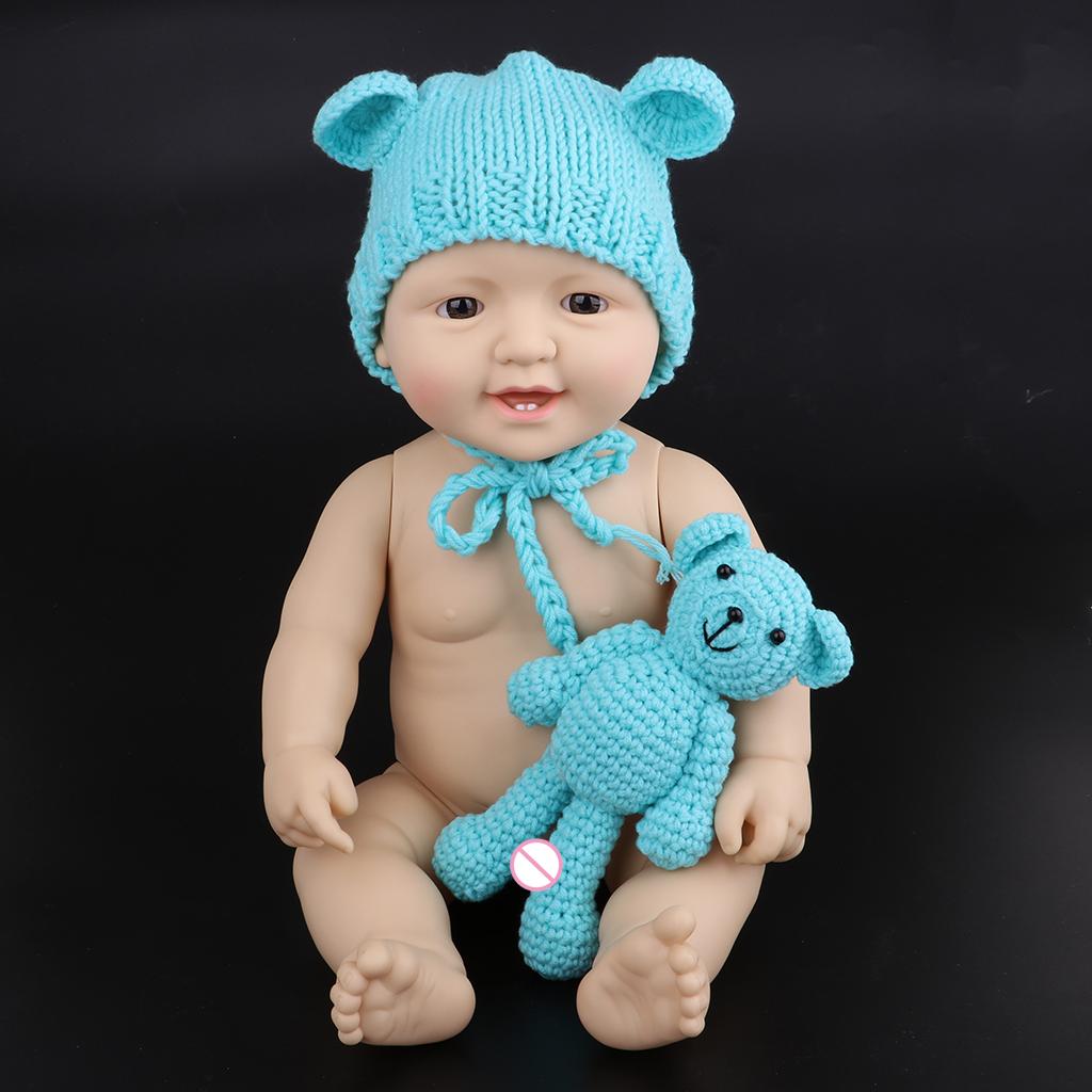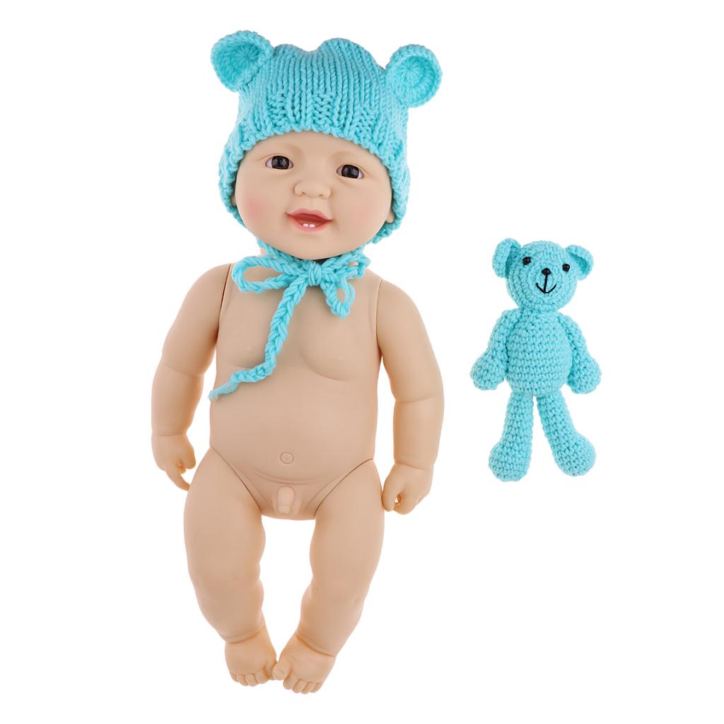 The doll with blue knitting hat(fits for 0-1 years old babys) and bear toy, features arms, legs and head are movable, can lie down and sit; can take a bath with your kids