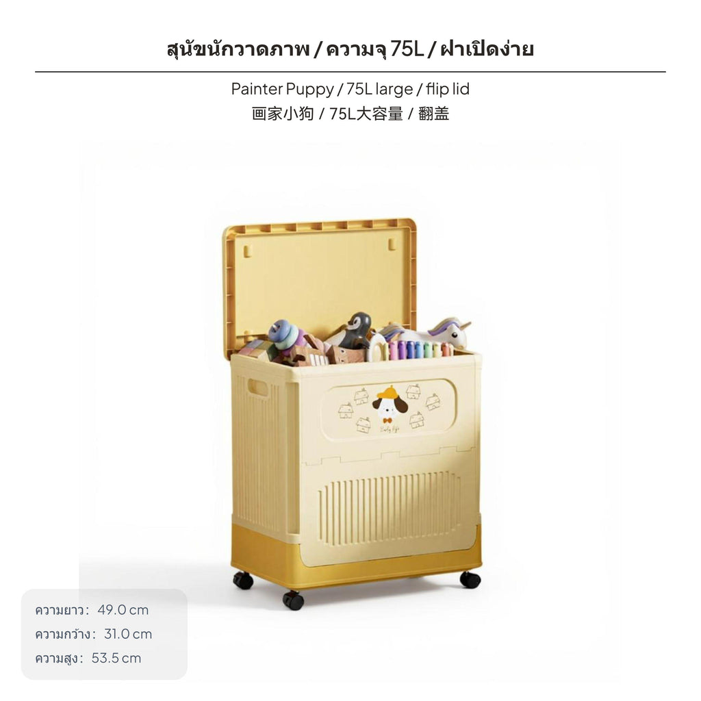 75L Large Capacity Storage Box, Flip Lid Organizer with casters, Stackable Toy and Clothes Bin for children' Room Painter Puppy