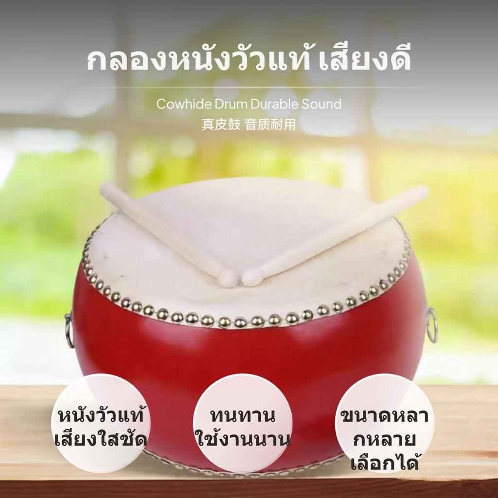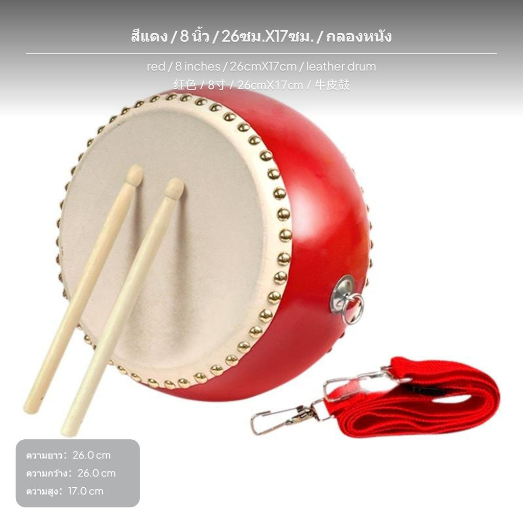 【Versatile 8-Inch Cowhide Drum】This 8-inch cowhide drum is designed for children ages 3-10, combining hand tapping and striking functions for music learning and performance activities.【Premium Materials】Features a thick cowhide drumhead, sturdy plastic body, and reinforced metal rings and rivets for crisp sound and lasting durability.【Safe & Eco-Friendly Design】Drum body coated with odorless eco-friendly lacquer, includes polished solid wood drumsticks and a quality fabric strap for safe play and easy carrying.【Wide Application Scenarios】Perfect for preschool, home entertainment, dance classes, school performances, and group activities, helping children develop rhythm and musical skills.【Multiple Sizes & Patterns Available】Choose from various sizes (5in/6in/7in/8in) and fun cartoon patterns (Nezha, Lucky Dragon) to suit different ages and preferences.Specification: