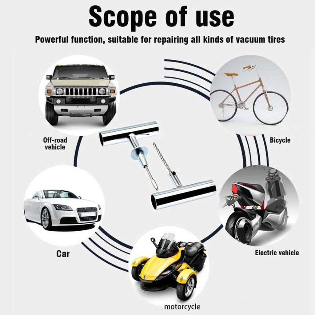 【Material】: Our Auto Tire Repair Set is made of Stainless steel material. The T shaped handle is made of solid A3 steel, which is stronger and more durable. The tire repair strip is made of rubber, which is durable and resistant to aging and hardening.