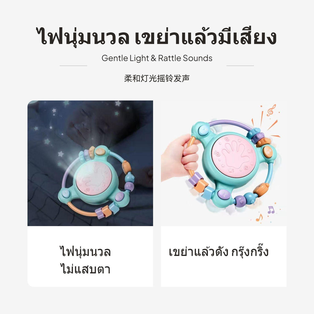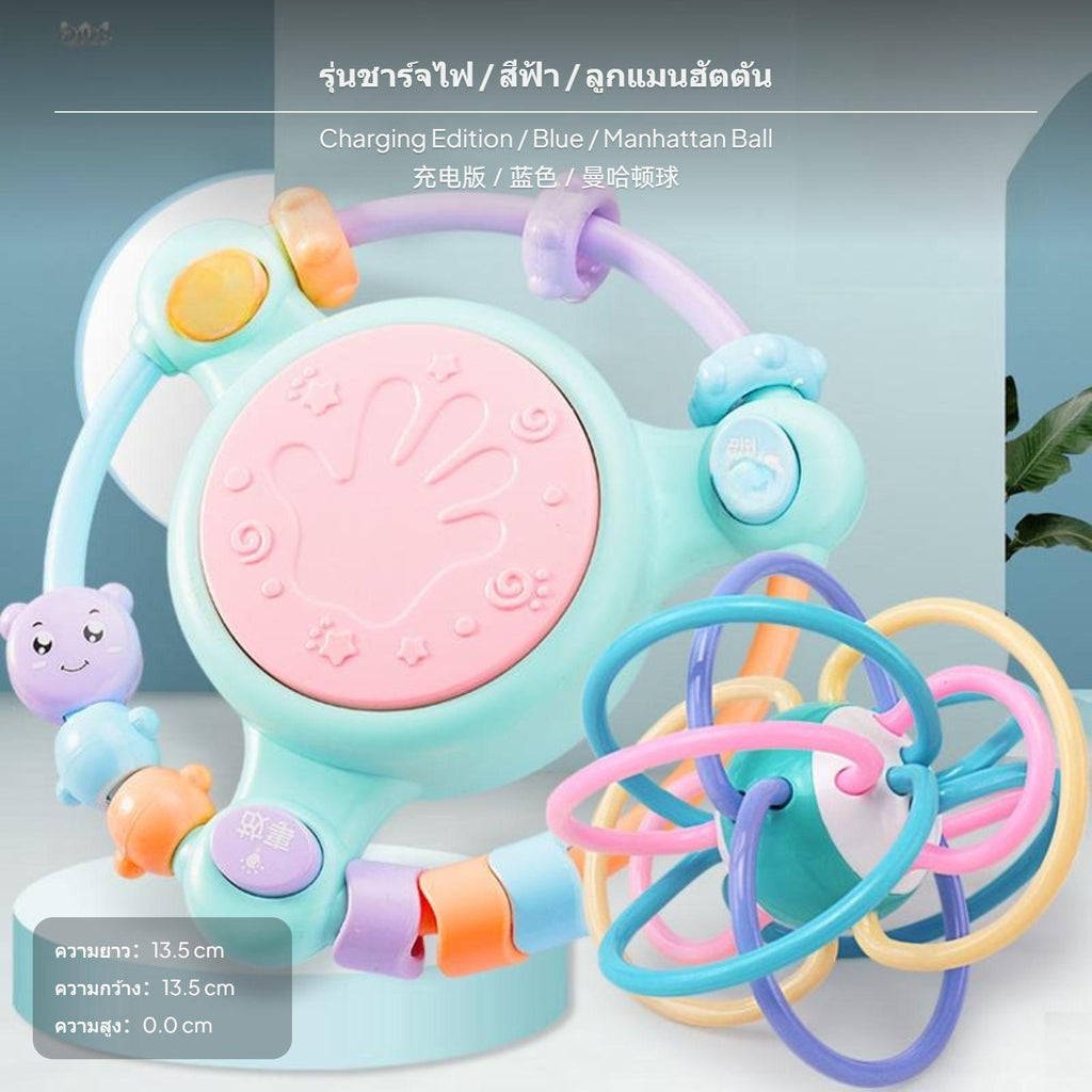 【Multi-Sensory Development】Combines baby drum, musical toy, and early learning features with story, song, and drum modes to stimulate auditory, tactile, and cognitive growth.【Safe & Durable Materials】Made from ABS and electronic components, featuring a cute cartoon design and soft pastel colors, suitable for infants and toddlers ages 0-3.【Interactive Rattle & Beads】Surrounded by colorful beads and rattle elements to enhance hand-eye coordination, grip strength, and fine motor skills.【Gentle Lights & Adjustable Volume】Soft glowing drum lights and adjustable volume protect your child's vision and hearing, ideal for nighttime comfort and daily play.【Multiple Power Options】Available in battery and rechargeable versions; select sets include bonus Manhattan ball or bilingual phone for enriched early education, making it a thoughtful gift for growing babies.Specification: