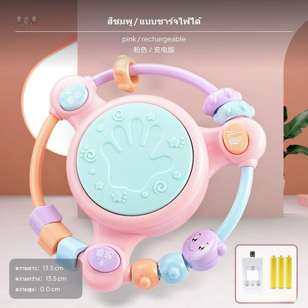 【Multi-Sensory Development】Combines baby drum, musical toy, and early learning features with story, song, and drum modes to stimulate auditory, tactile, and cognitive growth.【Safe & Durable Materials】Made from ABS and electronic components, featuring a cute cartoon design and soft pastel colors, suitable for infants and toddlers ages 0-3.【Interactive Rattle & Beads】Surrounded by colorful beads and rattle elements to enhance hand-eye coordination, grip strength, and fine motor skills.【Gentle Lights & Adjustable Volume】Soft glowing drum lights and adjustable volume protect your child's vision and hearing, ideal for nighttime comfort and daily play.【Multiple Power Options】Available in battery and rechargeable versions; select sets include bonus Manhattan ball or bilingual phone for enriched early education, making it a thoughtful gift for growing babies.Specification: