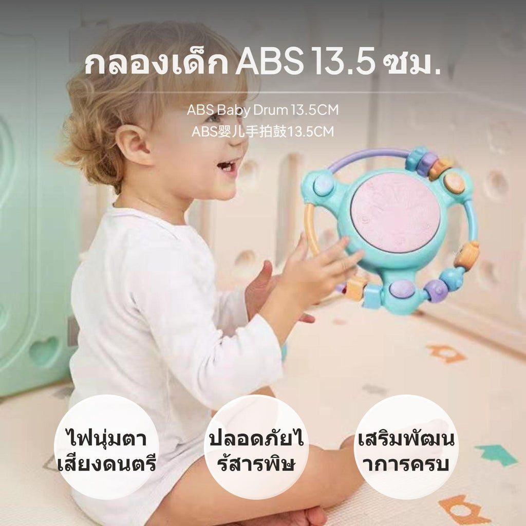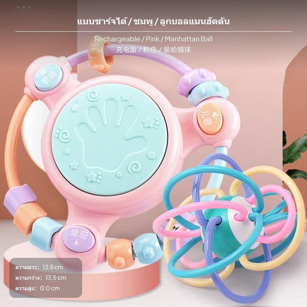 【Multi-Sensory Development】Combines baby drum, musical toy, and early learning features with story, song, and drum modes to stimulate auditory, tactile, and cognitive growth.【Safe & Durable Materials】Made from ABS and electronic components, featuring a cute cartoon design and soft pastel colors, suitable for infants and toddlers ages 0-3.【Interactive Rattle & Beads】Surrounded by colorful beads and rattle elements to enhance hand-eye coordination, grip strength, and fine motor skills.【Gentle Lights & Adjustable Volume】Soft glowing drum lights and adjustable volume protect your child's vision and hearing, ideal for nighttime comfort and daily play.【Multiple Power Options】Available in battery and rechargeable versions; select sets include bonus Manhattan ball or bilingual phone for enriched early education, making it a thoughtful gift for growing babies.Specification: