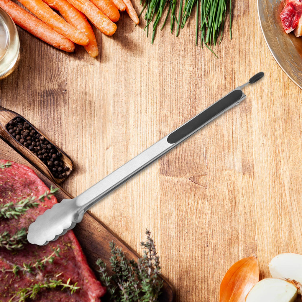 【Nonstick, Anti Slip】: Food tongs long tweezer feature serrated stainless steel Tongs heads and tpr antislip strip, which can firmly grip, flip, move the food and avoid falling, and won't scratch your cookware.