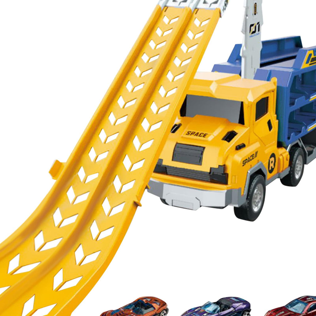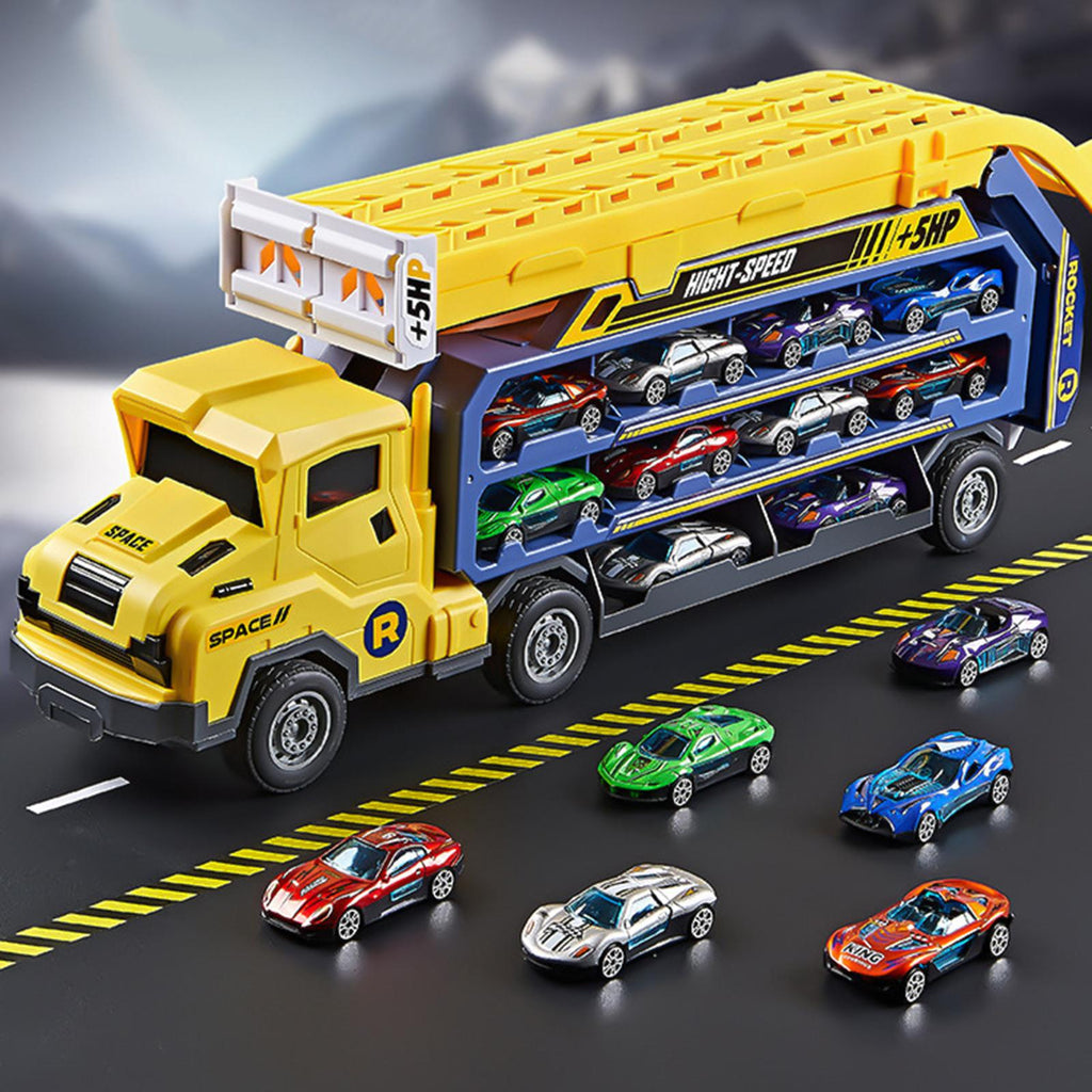 【Deforming and Elevating Design】: Big hauler transporter truck toy can transform into a high altitude slide track. Simply pull up the track switch at the top, and the small alloy car will glide down, providing children with an exciting race experience.