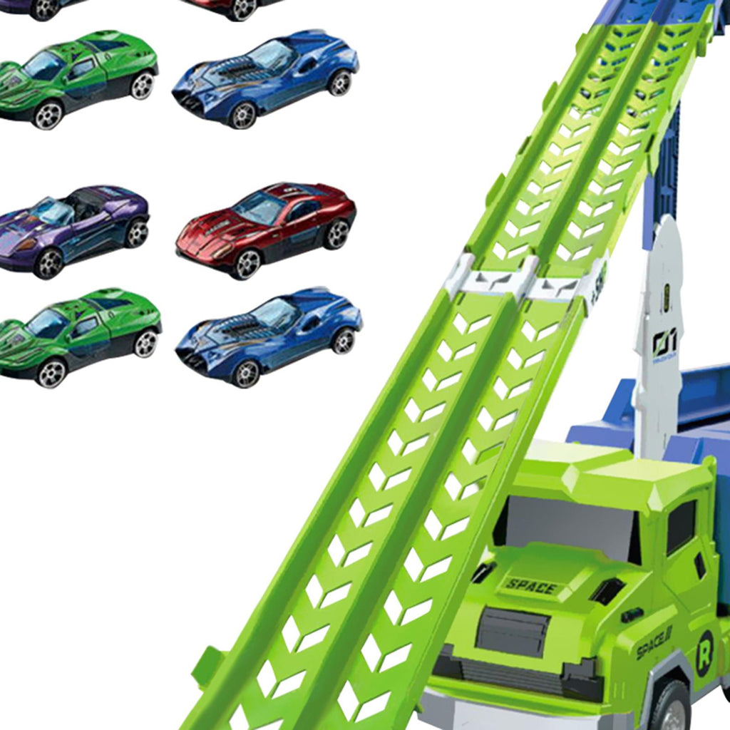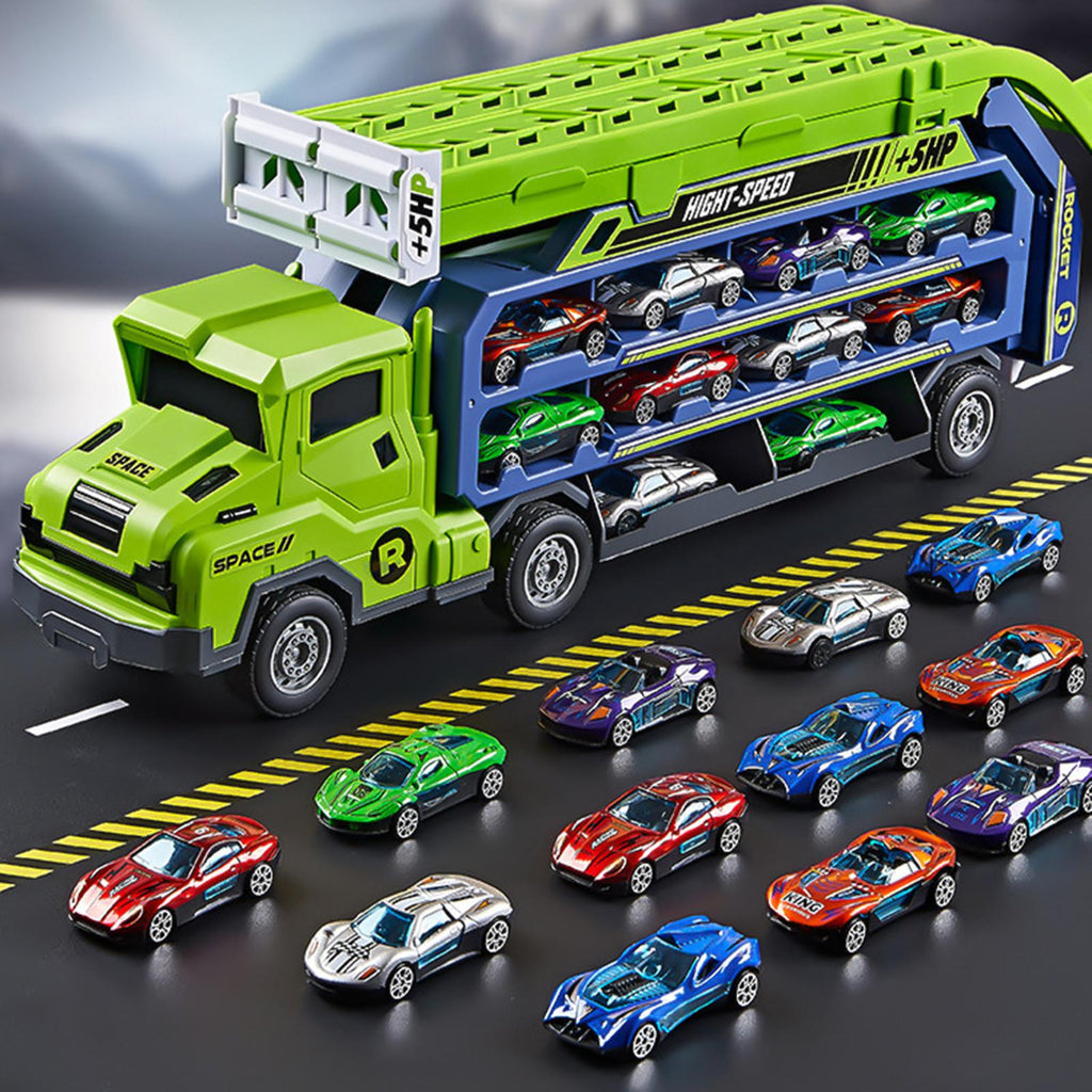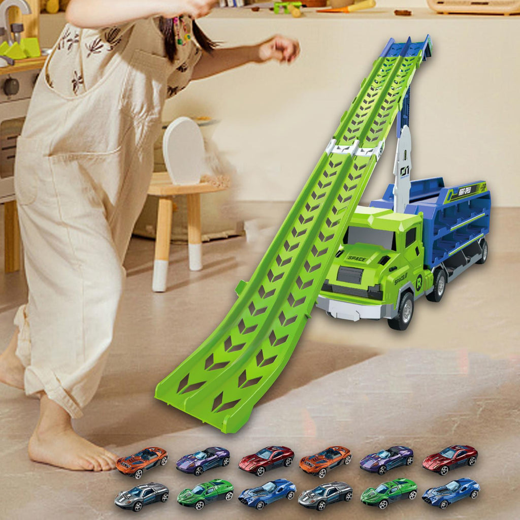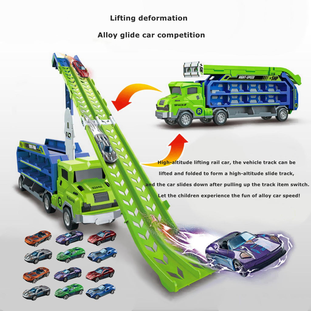 【Deforming and Elevating Design】: Big hauler transporter truck toy can transform into a high altitude slide track. Simply pull up the track switch at the top, and the small alloy car will glide down, providing children with an exciting race experience.