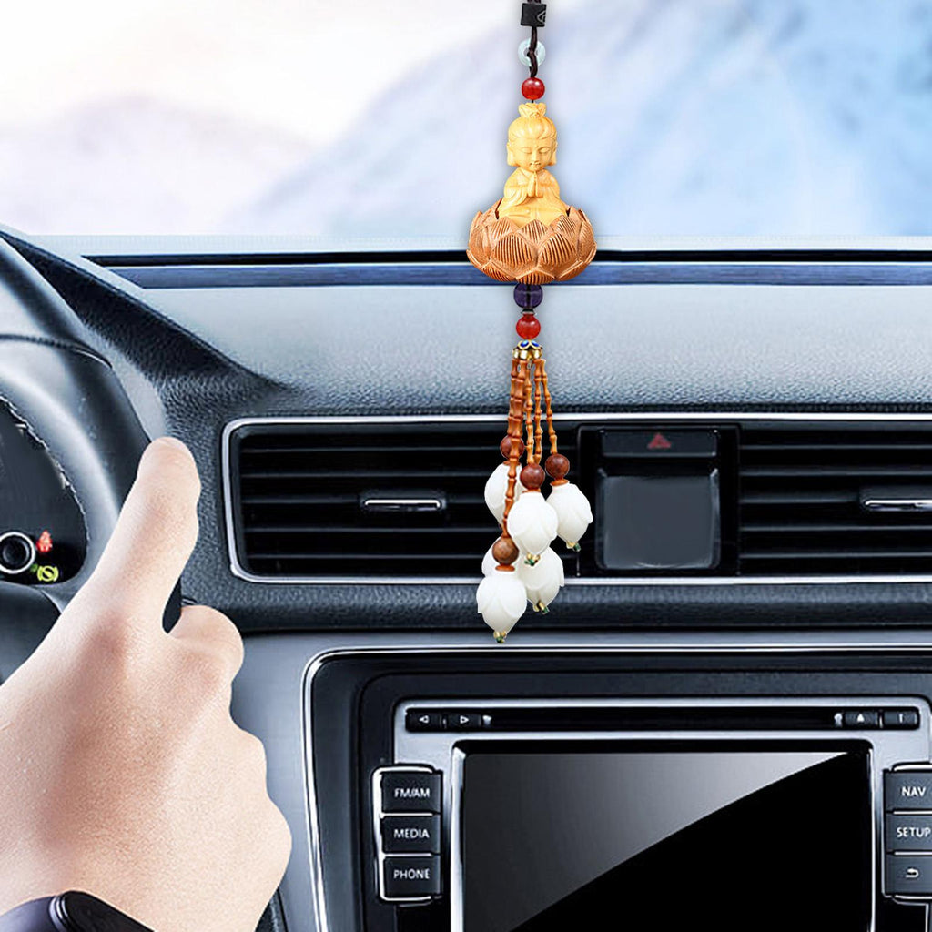 【Auto Interior Dangle】: Delicate Buddha statue car rearview mirror pendant, decorated with lotus base, Magnolias, and beads, excellent and beautiful.