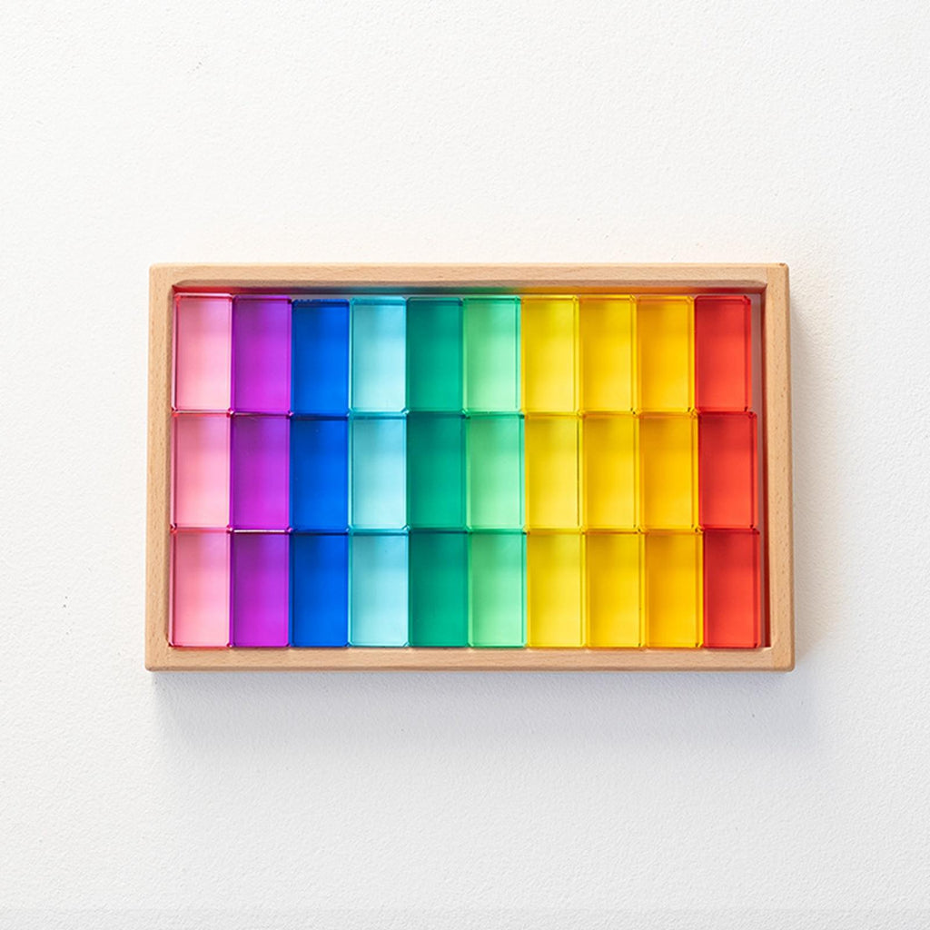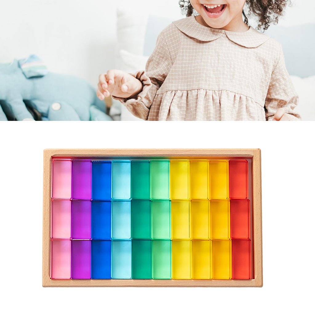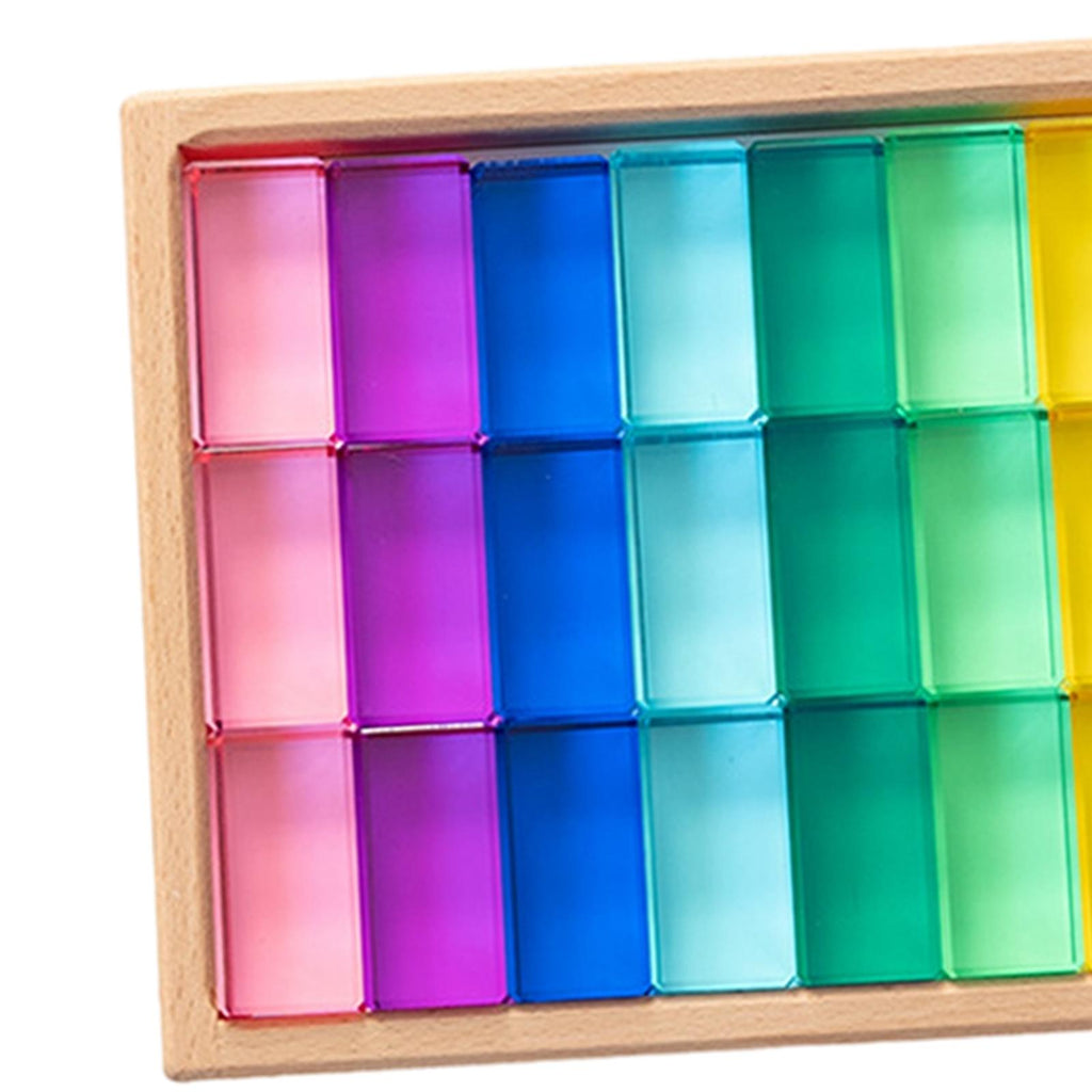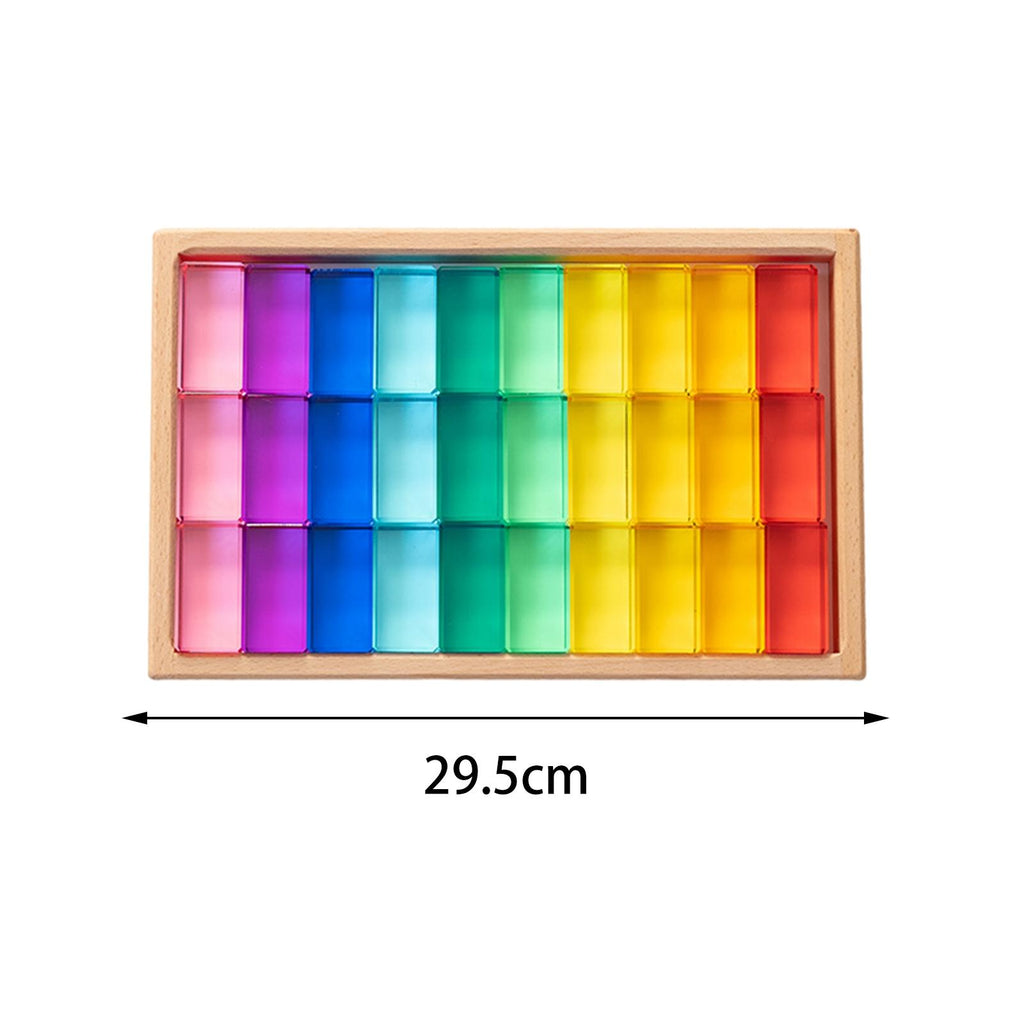 【Material】: The rainbow building blocks set is made of high quality acrylic material, and the box is carefully made of solid wood, which is safe and durable, smooth and durable.