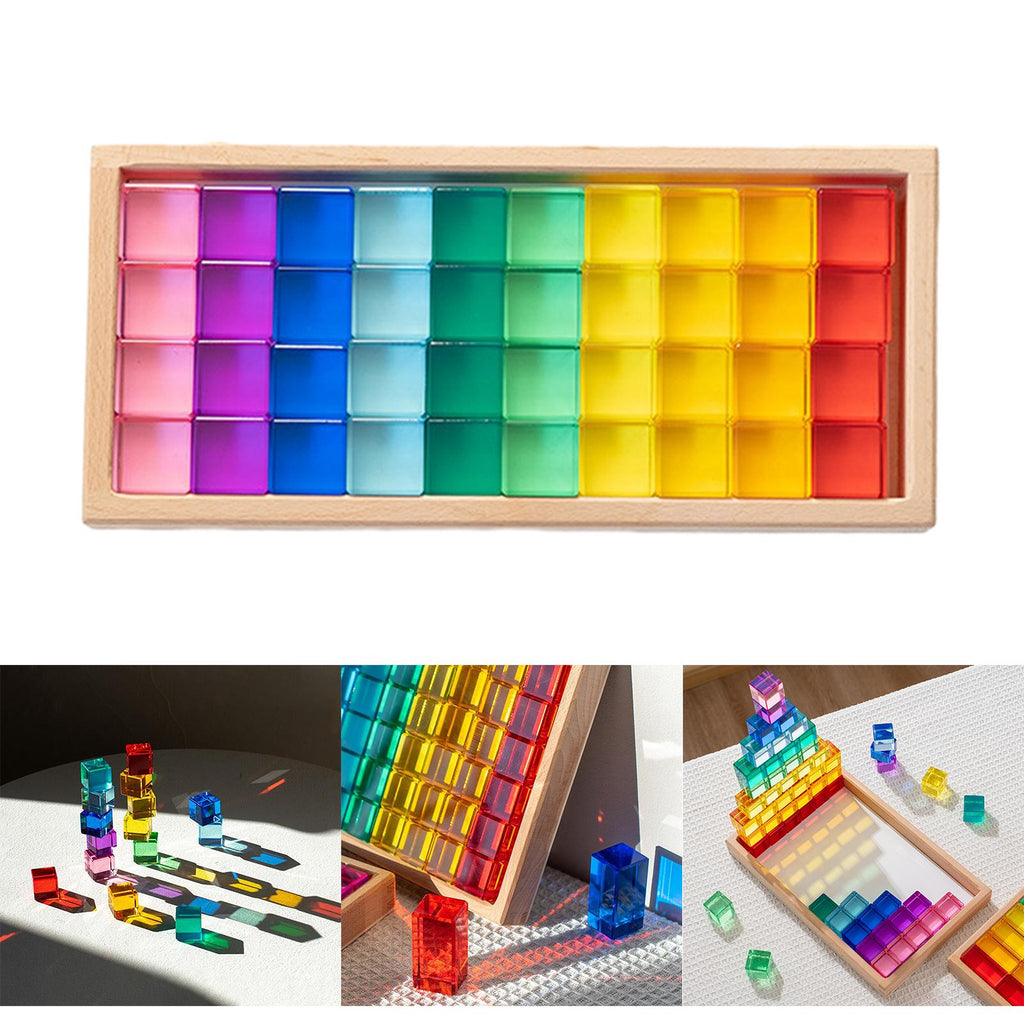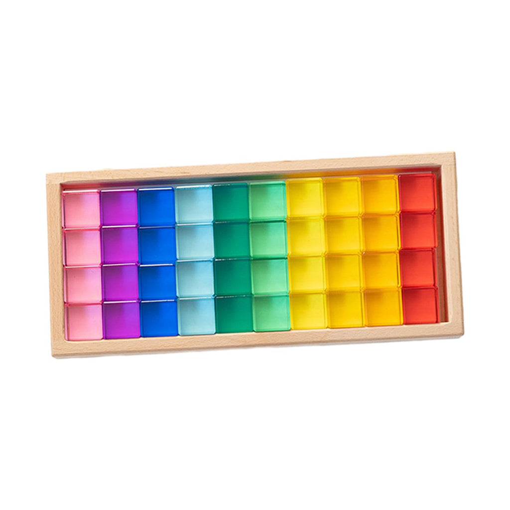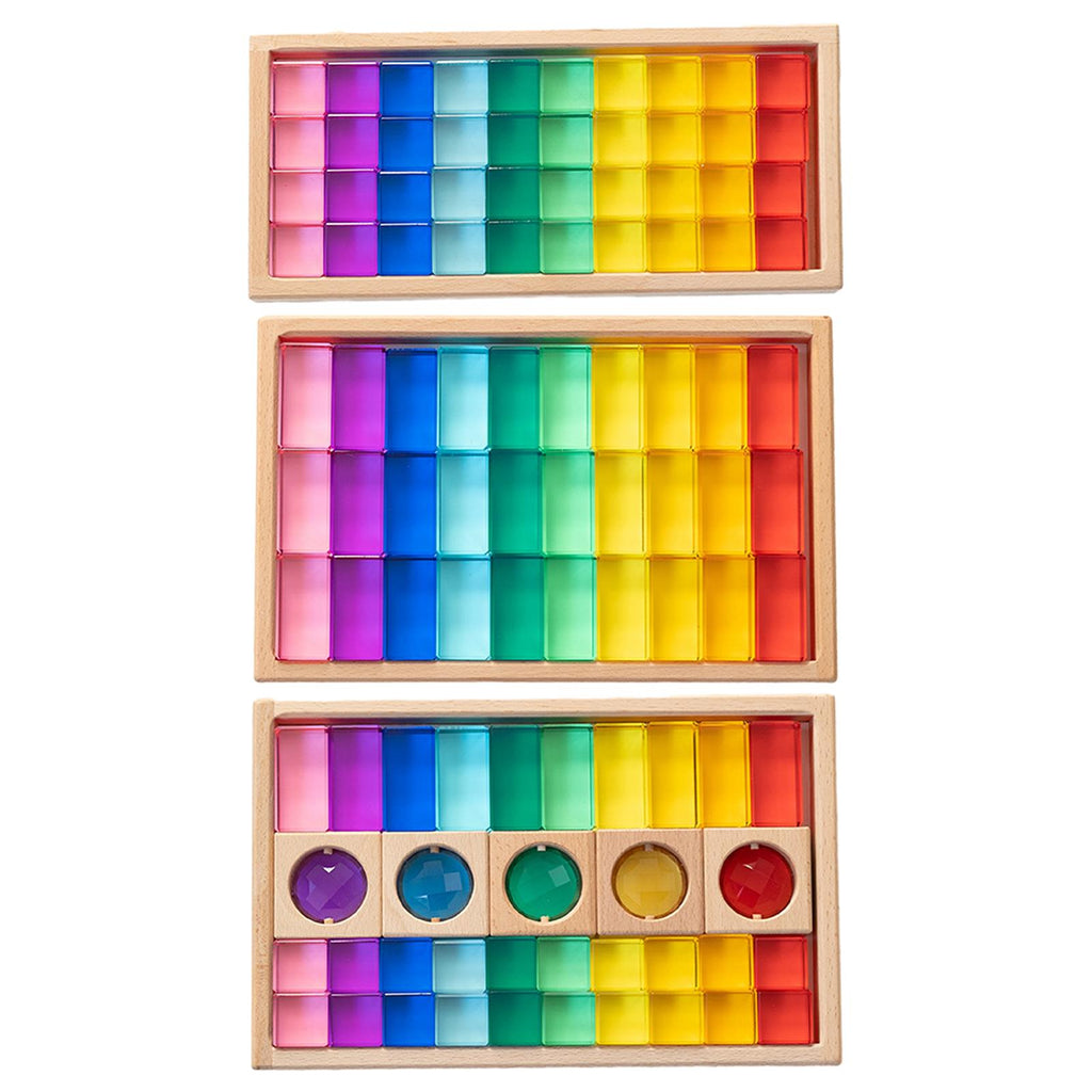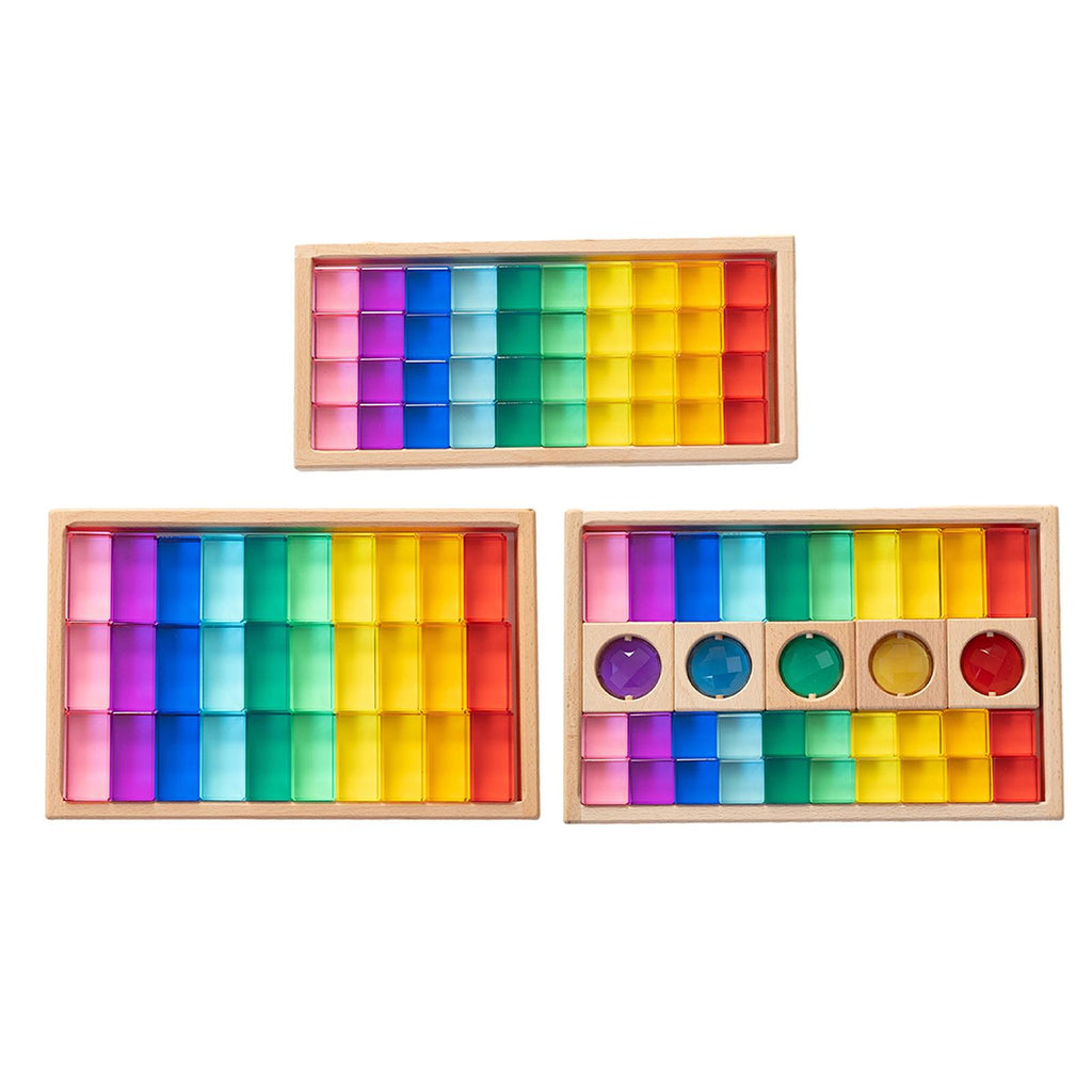 【Material】: The rainbow building blocks set is made of high quality acrylic material, and the box is carefully made of solid wood, which is safe and durable, smooth and durable.