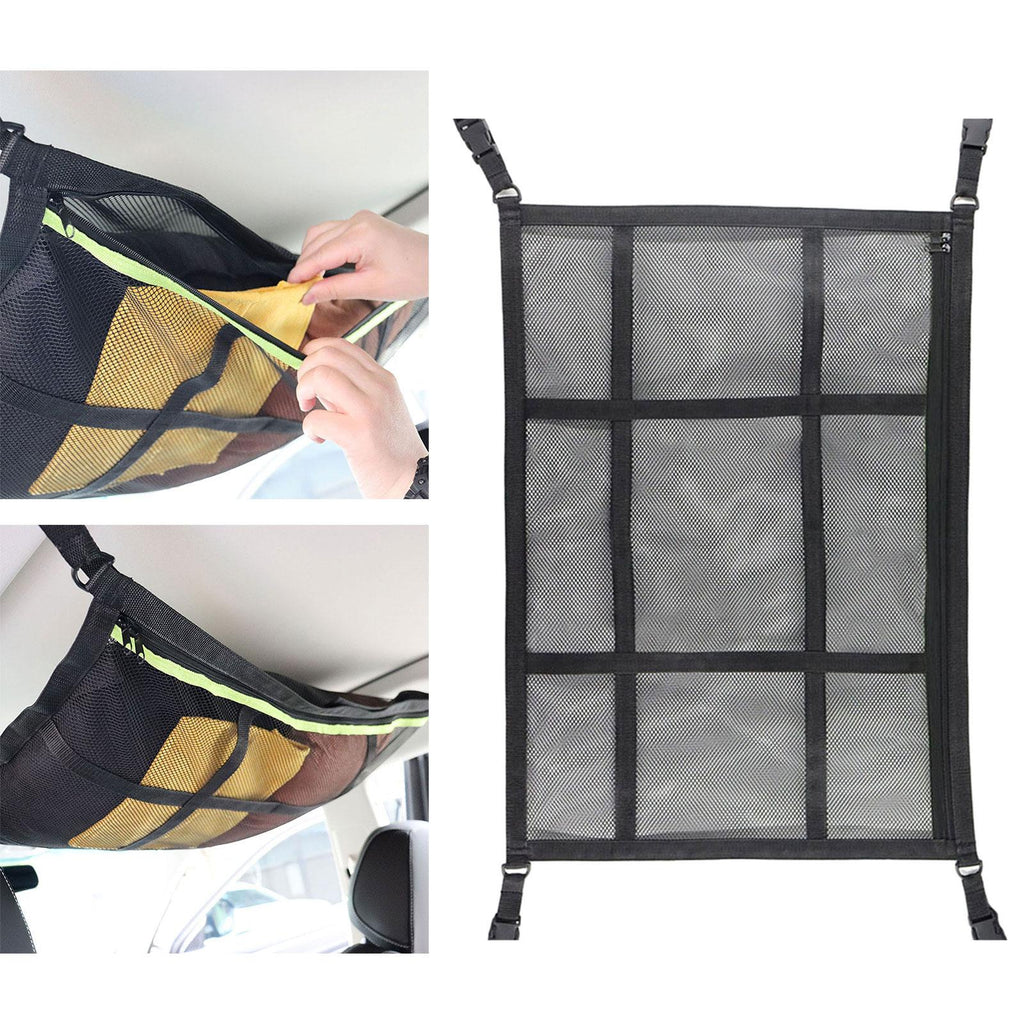 【Strengthen Load Bearing】: Car roof storage organizer, 4 rows of reinforced webbing design delay the sagging of the cargo net and strengthen load bearing. Double zipper design, easy to put and access items, prevent the goods from falling and ensure driving comfort.
