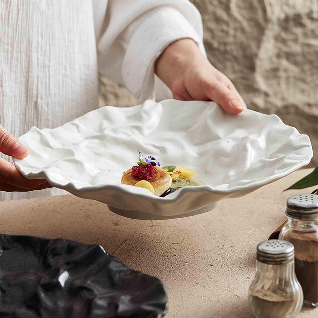 【Easy to Take】:The ceramic dinner plates with irregular edge design, protruding handle, easy to take, easy to clean. Having a slight bowl type shape at the ends and don't allow the food to fall out.