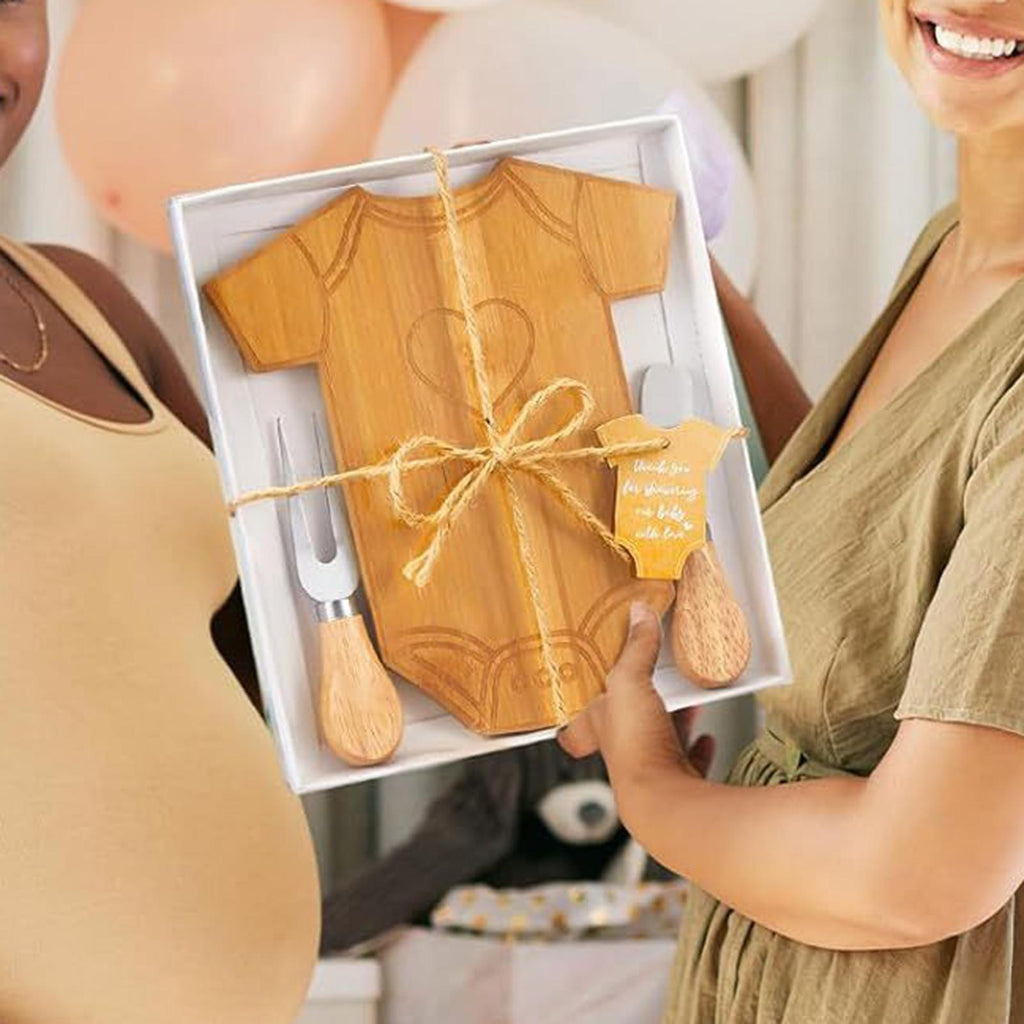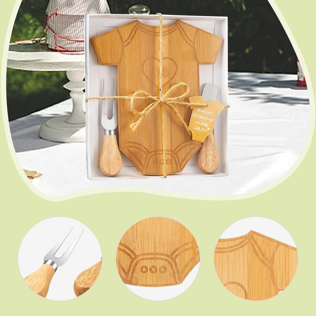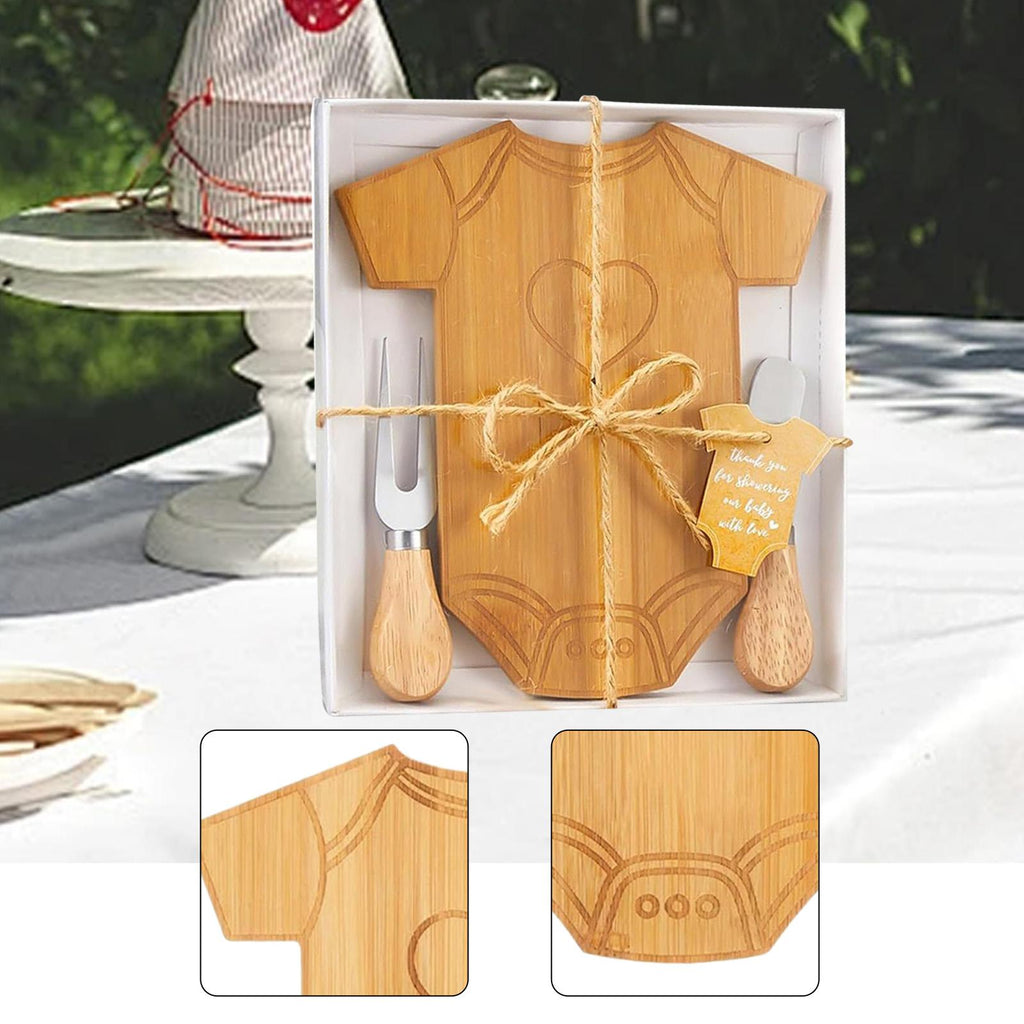 - 【Baby Shower Gifts for Guests】We will provide you with a total of 1 Charcuterie Board Set, including 1 clothing shaped cutting board, 1 butter knife and 1 fork, packed in 1 gift box with thank you tag and tied up with rope. Rich accessories can easily meet your needs for party use
