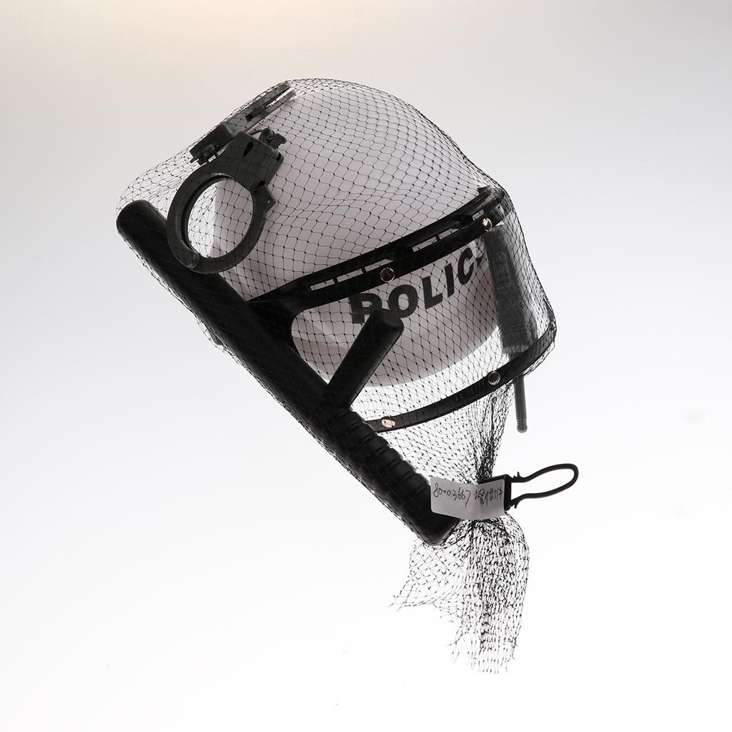 Comes with 5 pieces: 1 helmet hat, 1 bar, 1 handcuff, 1 walkie-talkie, 1 badge