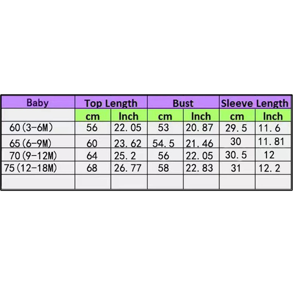 60 (3-6M): Length: 56cm, Bust: 53cm, Sleeve Length: 29.5cm;