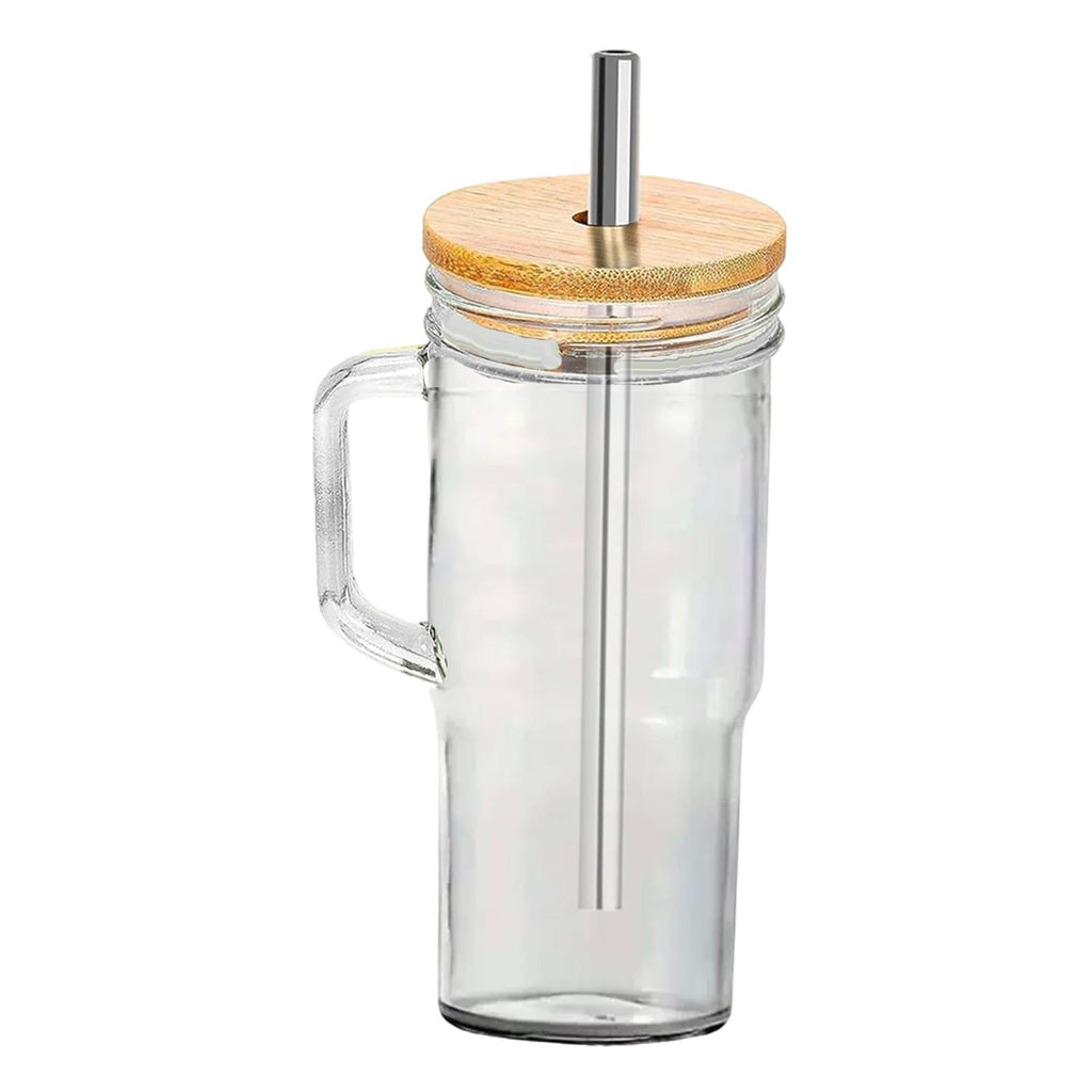 【Drinking Glass】24oz Water Tumbler with handle is equipped with wooden lid cover and straw, suitable for home, kitchen, office, cafes, bars, restaurants, etc.