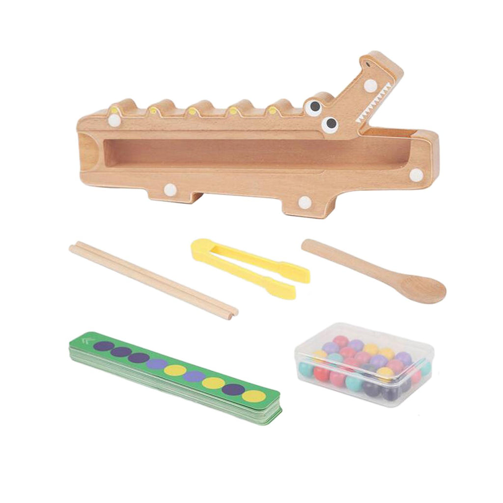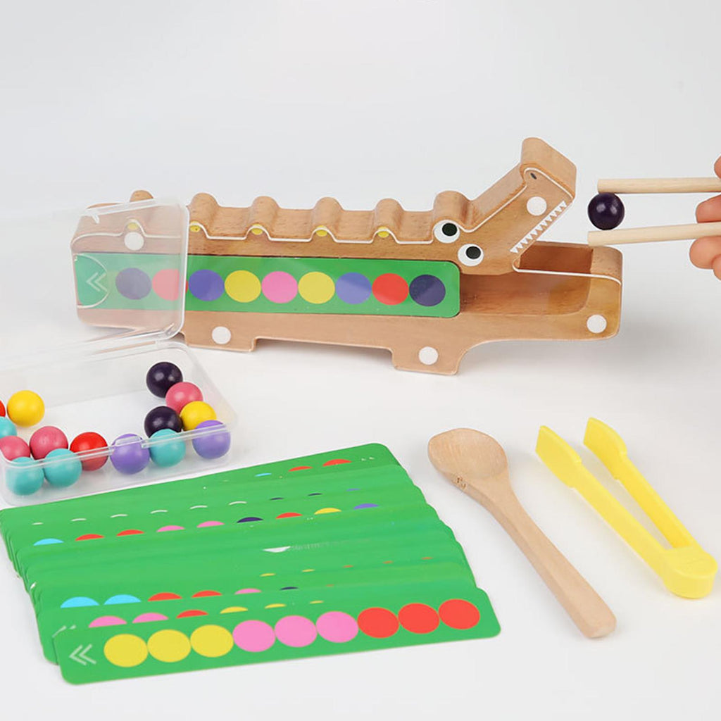 【Interactive Play】: Simply choose a card, insert it into the crocodile base, then use the chopsticks, spoon, clip to feed the beads into the crocodile's mouth according to the card instructions.