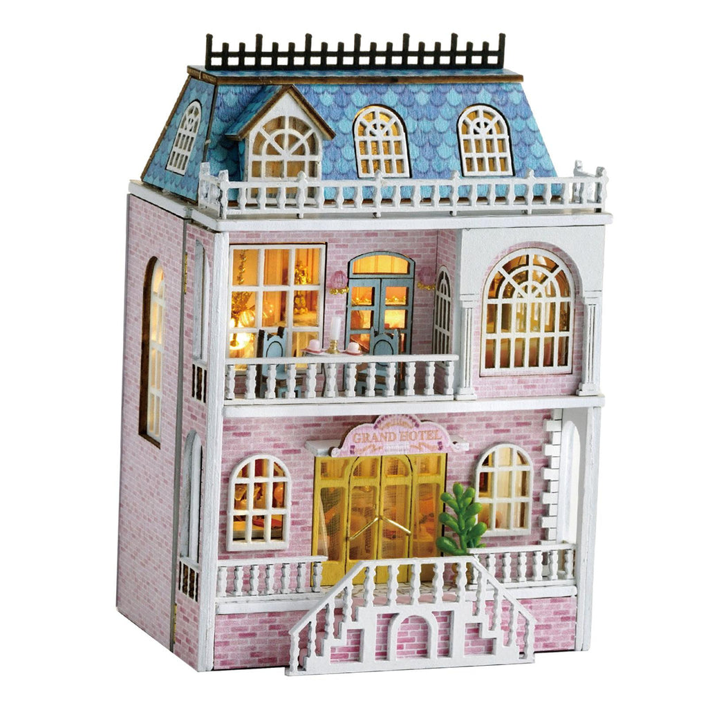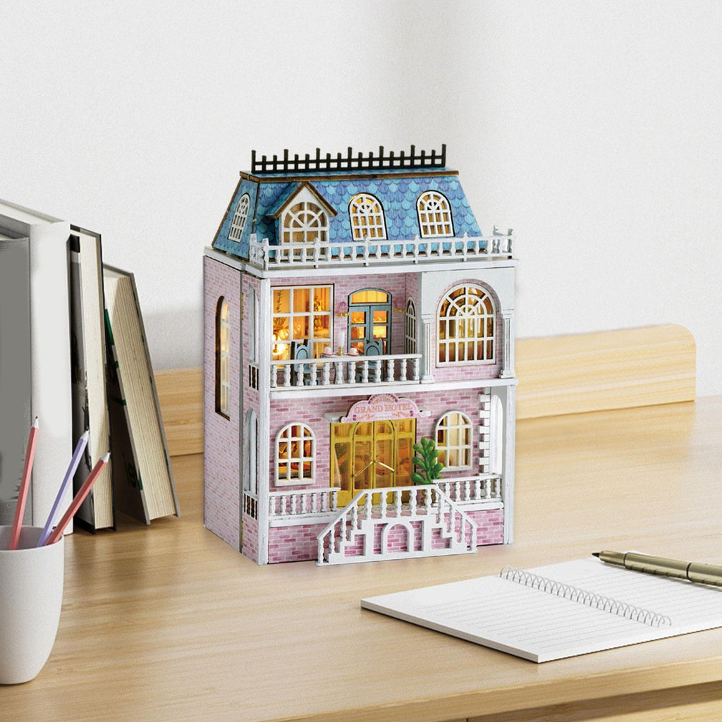 【DIY Wooden Miniature Building Kits】: Wooden dollhouse with LED lights and furniture accessories.