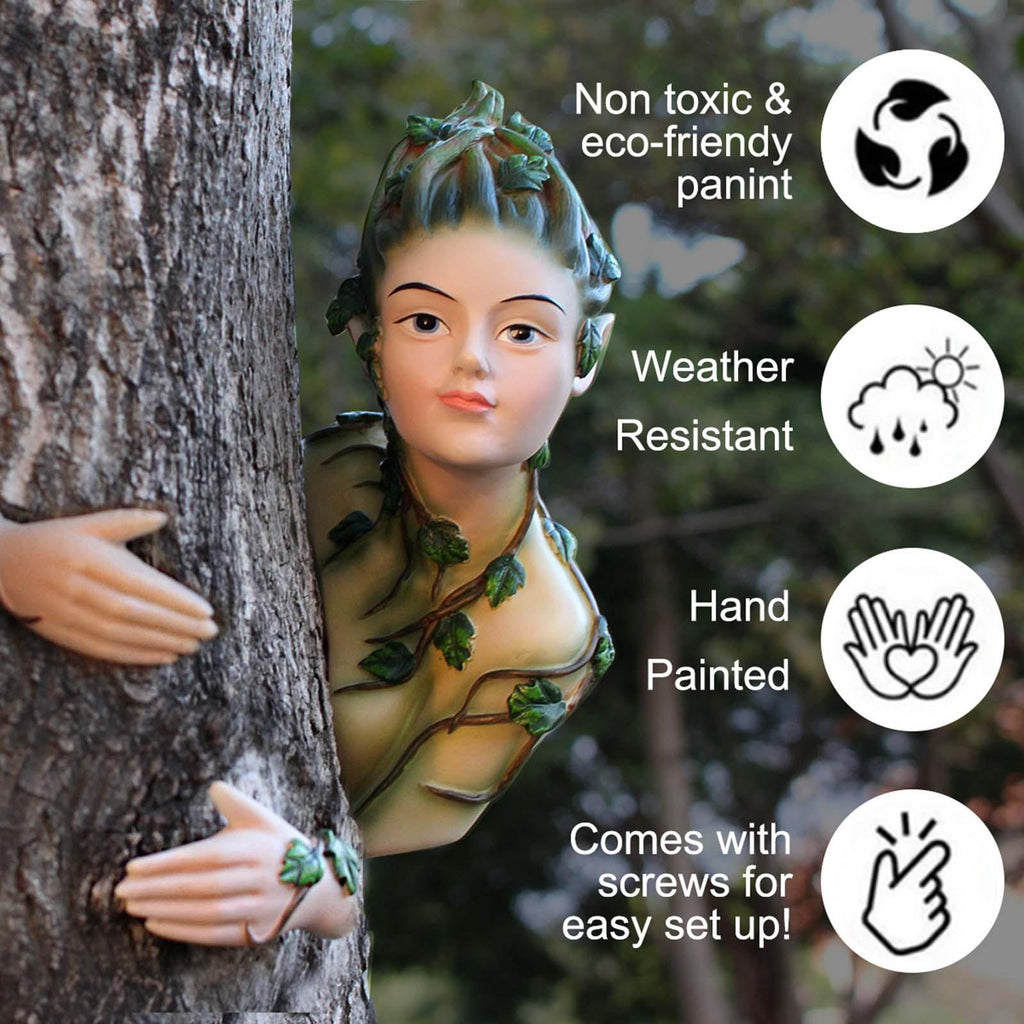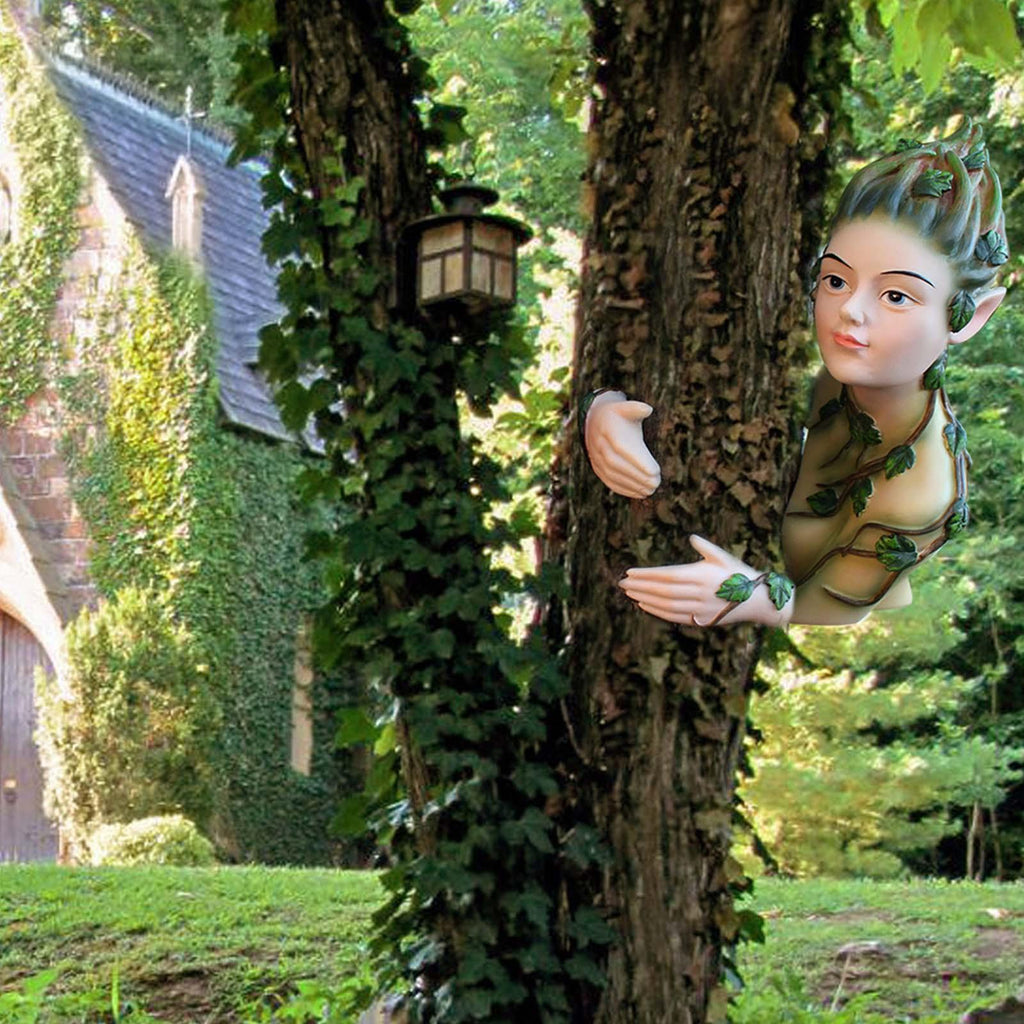 【Novelty and Adorable】: Elf tree hugger sculpture mounts her face and hand on a side of a tree and places the other hand on the opposite side and peeking out from behind, creating a humorous surprise in the garden yard.