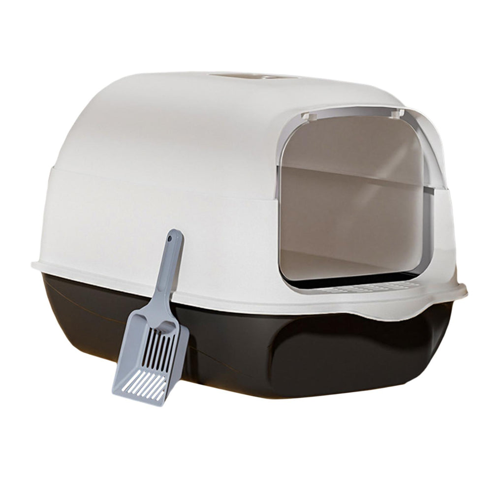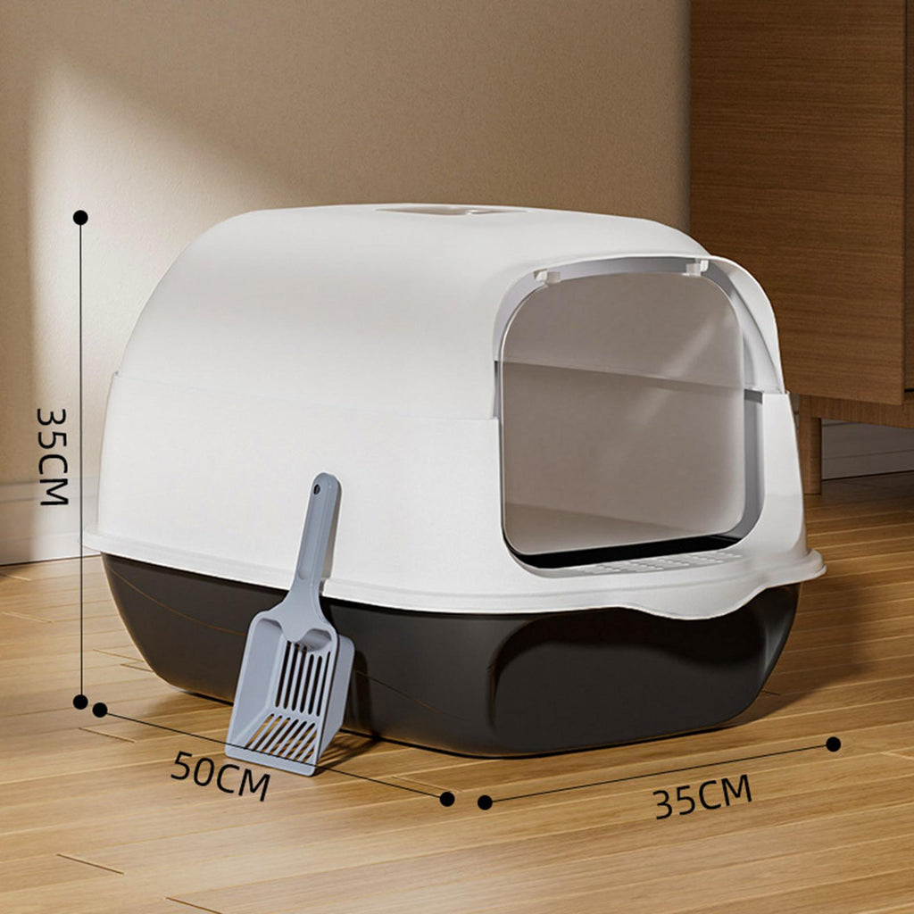 【Splashproof】: Fully covered cat toilet adopts a deep basin design, which can effectively prevent cat litter from being thrown around the potty. Transparent door partitions block odors.