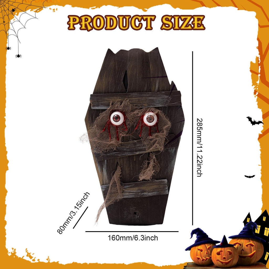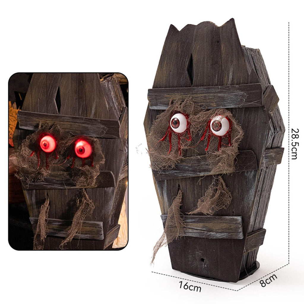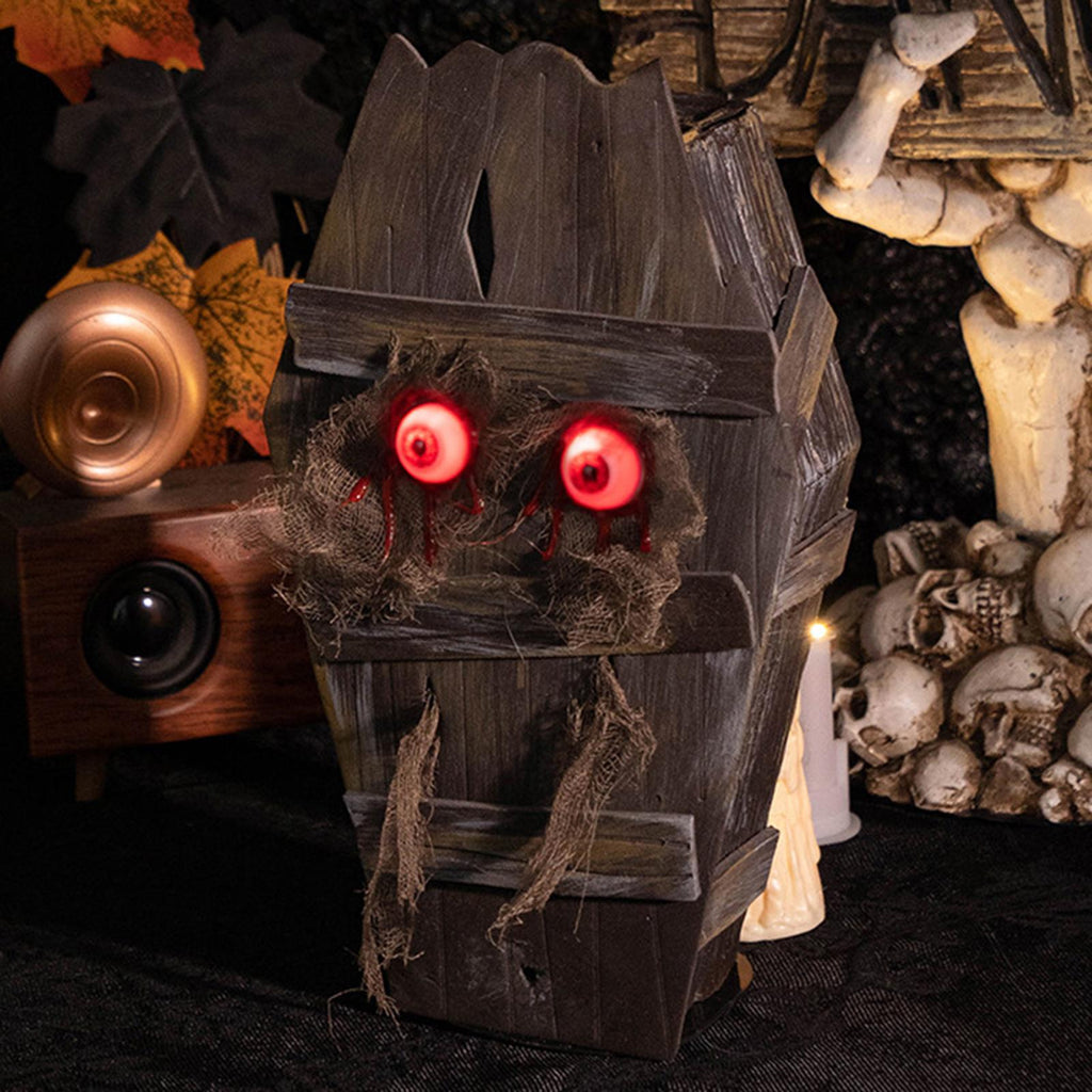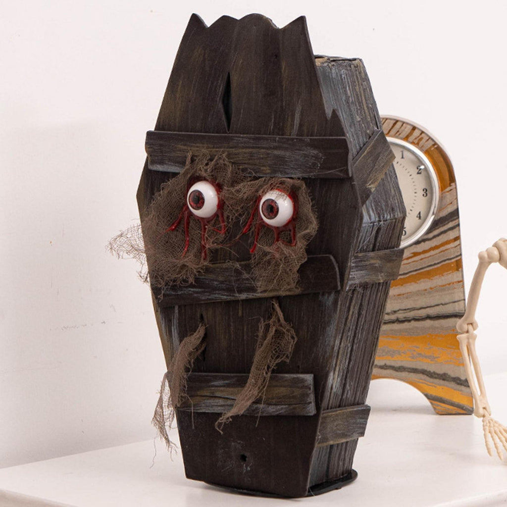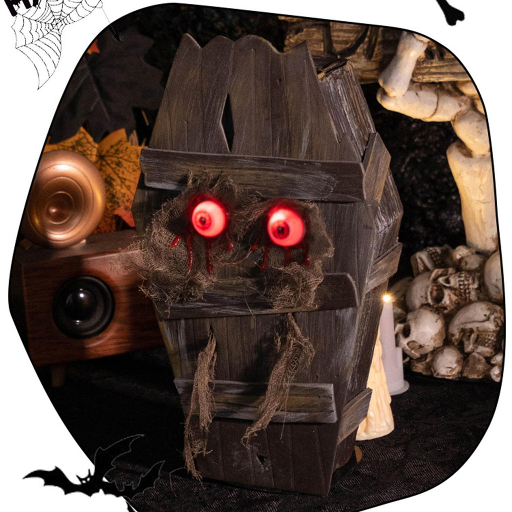 - 【Spooky Coffin Design】: This Halloween prop mimics an ancient wooden coffin with a rough, weathered finish for an eerie look. Bloody and glowing eyes add a chilling touch, great for haunted decor