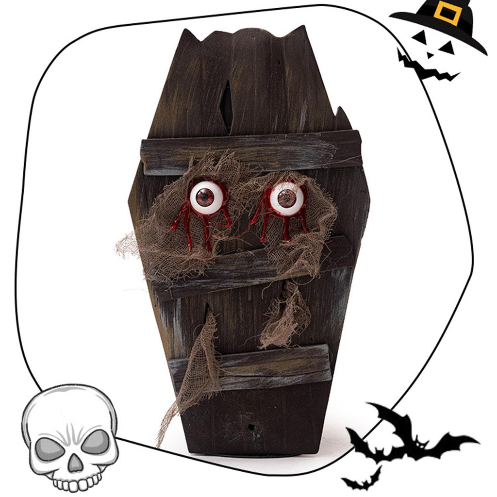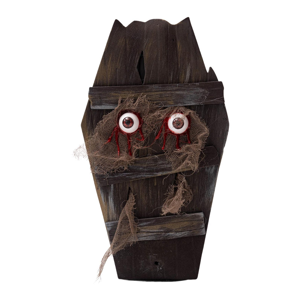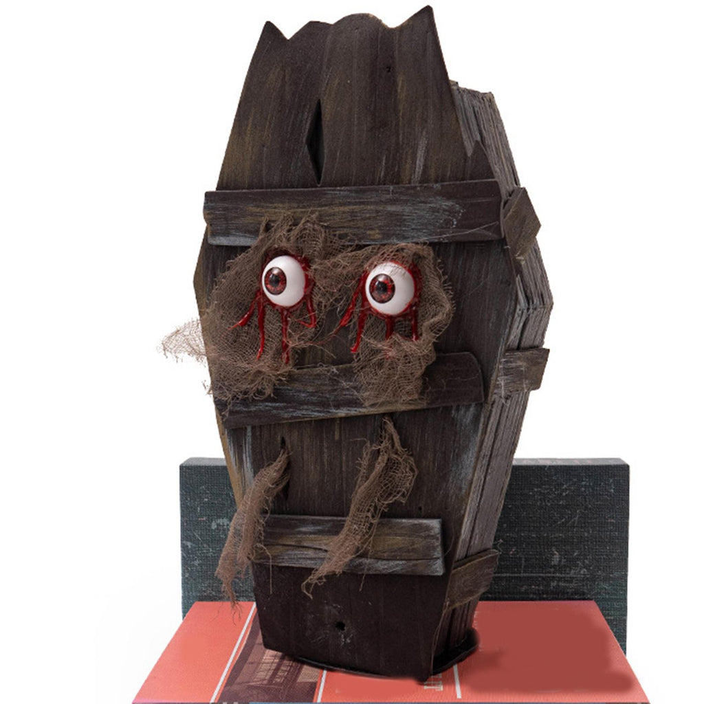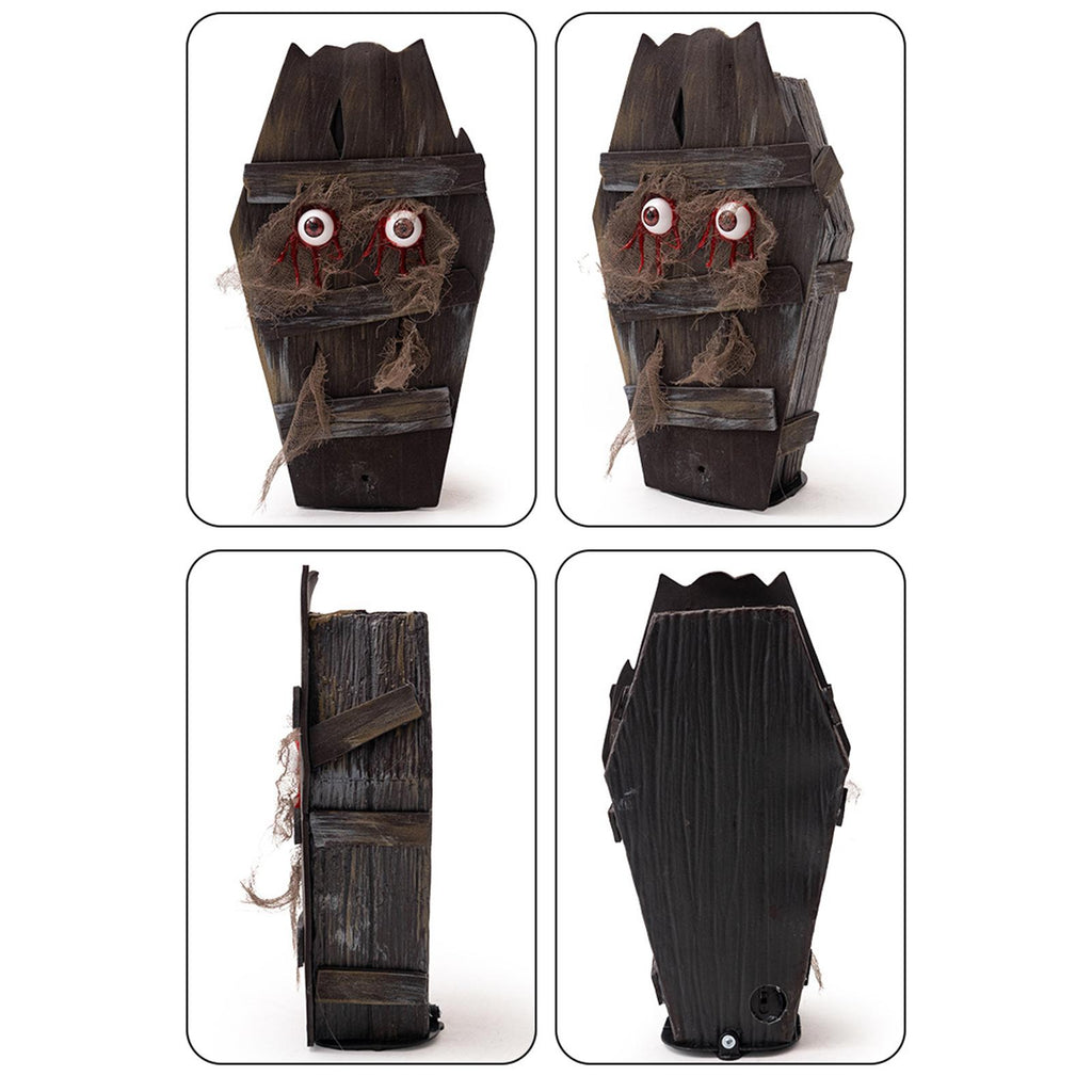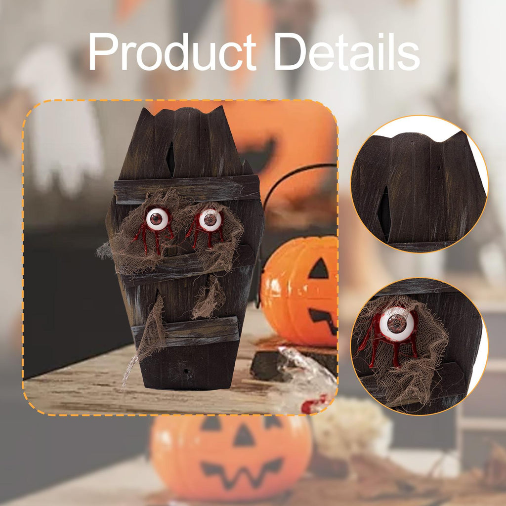 - 【Spooky Coffin Design】: This Halloween prop mimics an ancient wooden coffin with a rough, weathered finish for an eerie look. Bloody and glowing eyes add a chilling touch, great for haunted decor