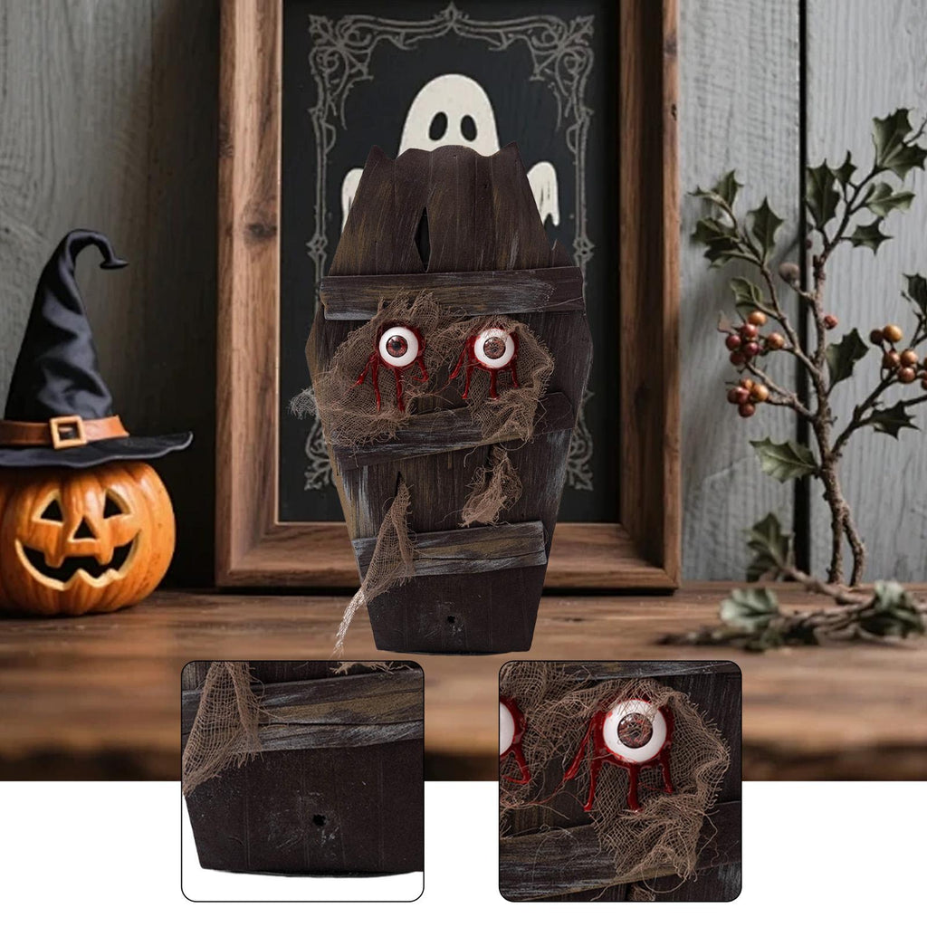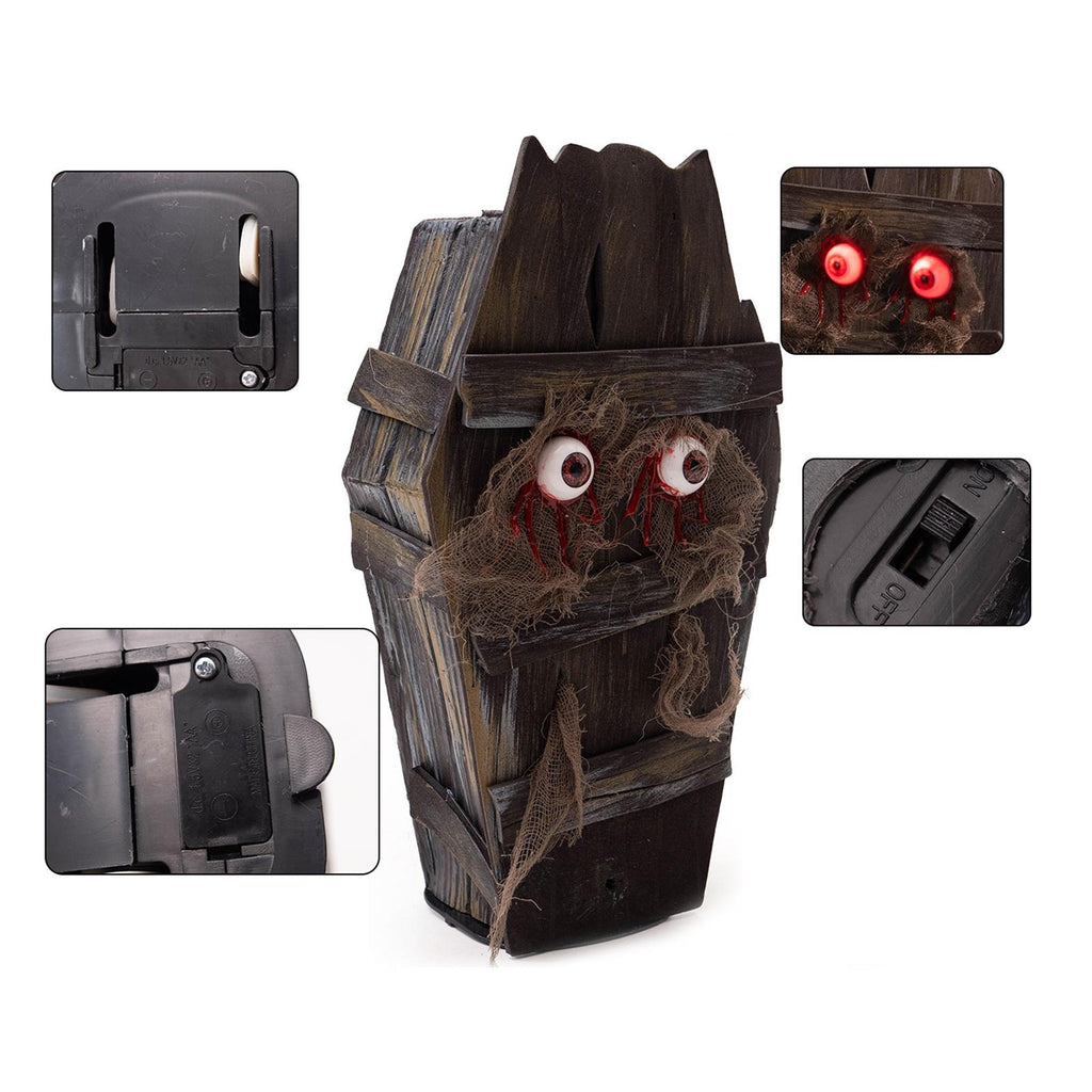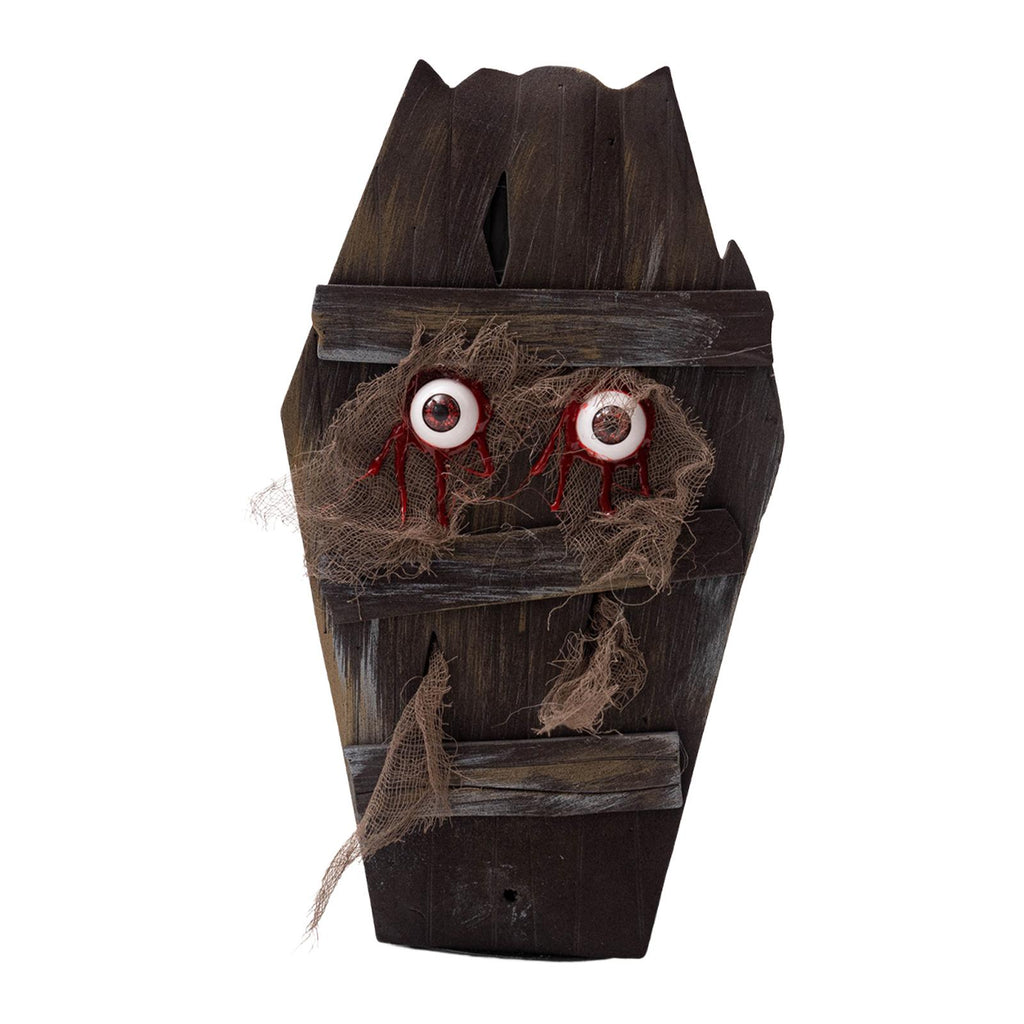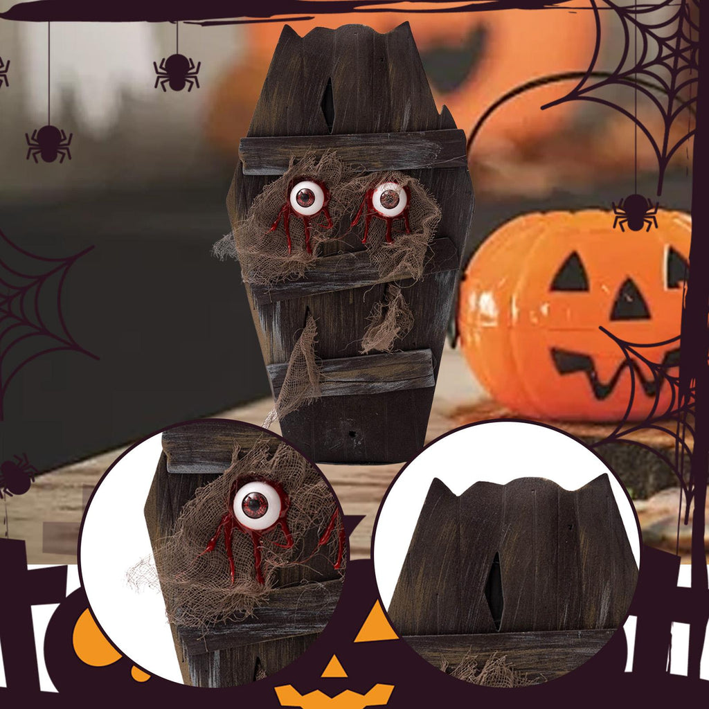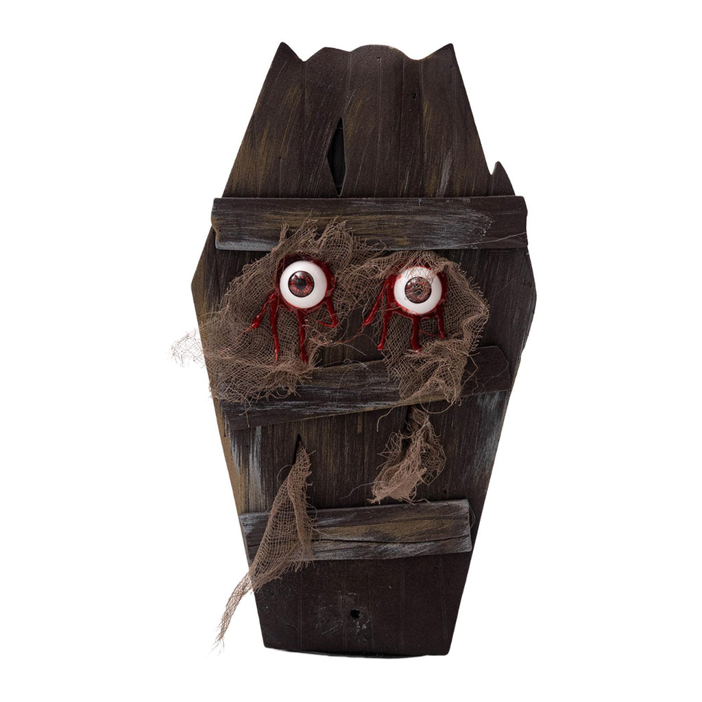 - 【Spooky Coffin Design】: This Halloween prop mimics an ancient wooden coffin with a rough, weathered finish for an eerie look. Bloody and glowing eyes add a chilling touch, great for haunted decor