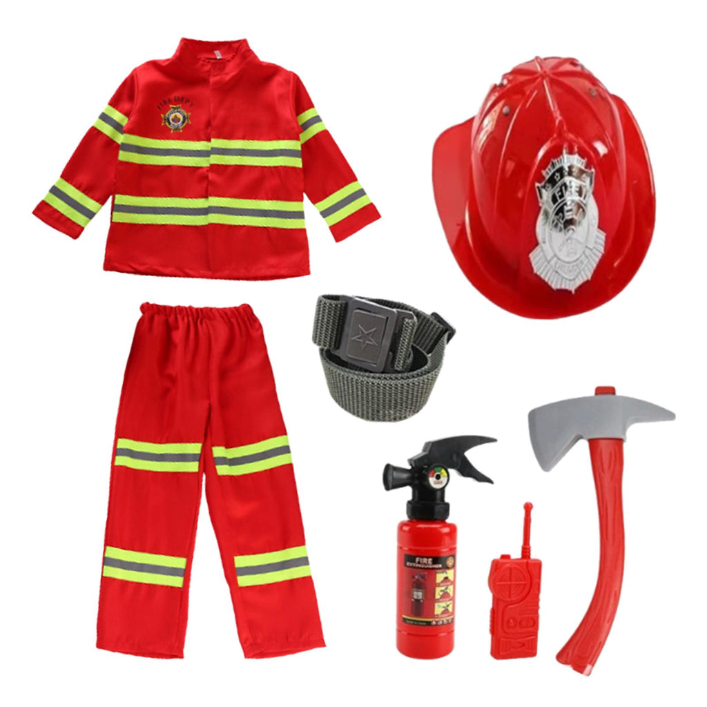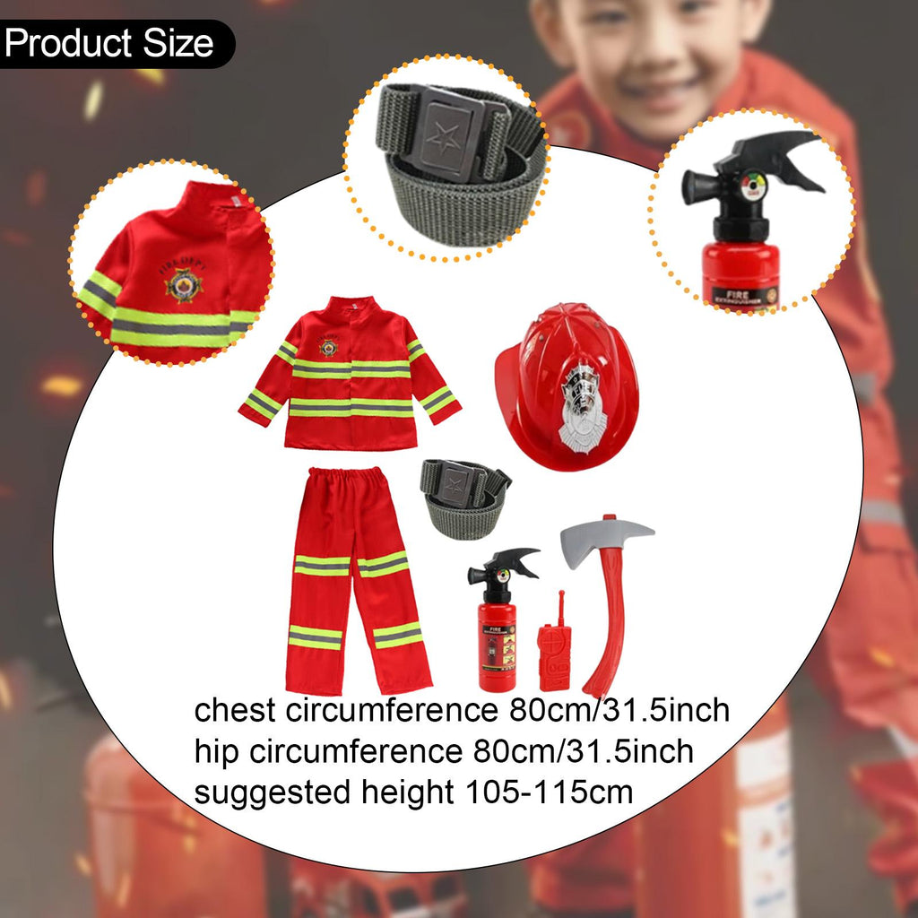 【Firefighter Costume Set】: This children firefighter costume set is great for Halloween party decorations, includes Firefighter Costume, a belt, and helmet, toy extinguisher and other