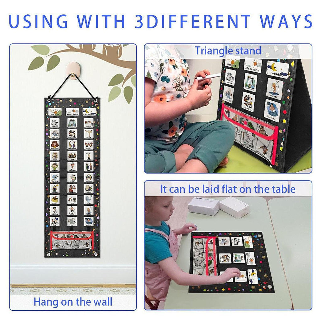【Visual Schedule Calendar】: Our routine chores chart for kids design, can be hung on wall, displayed vertically or horizontally, can also be folded into a triangular shape for tabletop use. Its engaging design captures children's attention effortlessly