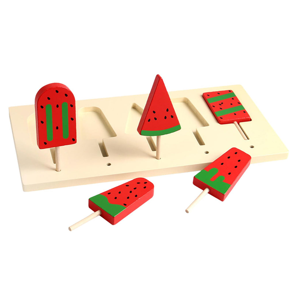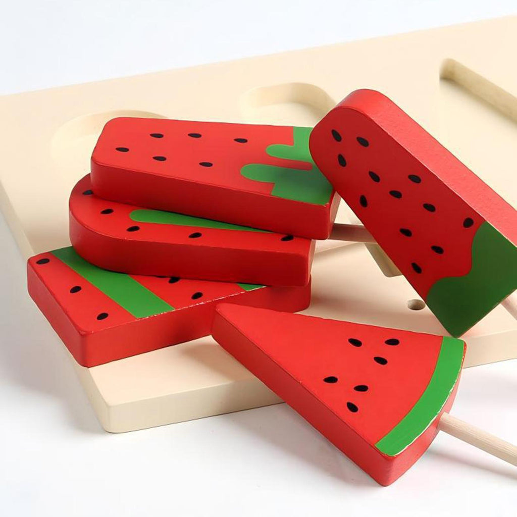 【Wooden Ice Cream Toy】: Wooden role play food toys, includes 5 wooden watermelon ice lollies in different shapes and 1 base, creative, realistic and fun
