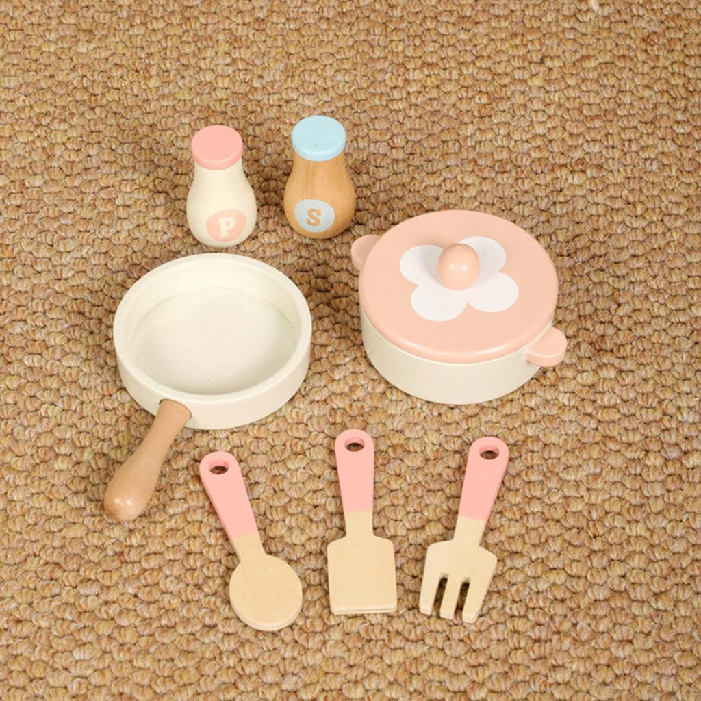 【Wooden Accessories】: Pretend Play Cooking Playset includes wooden kitchen utensils, including spice bottles, spatulas, frying pans, and double handled pots. Each accessory is careful crafted to withstand children's enthusiastic play