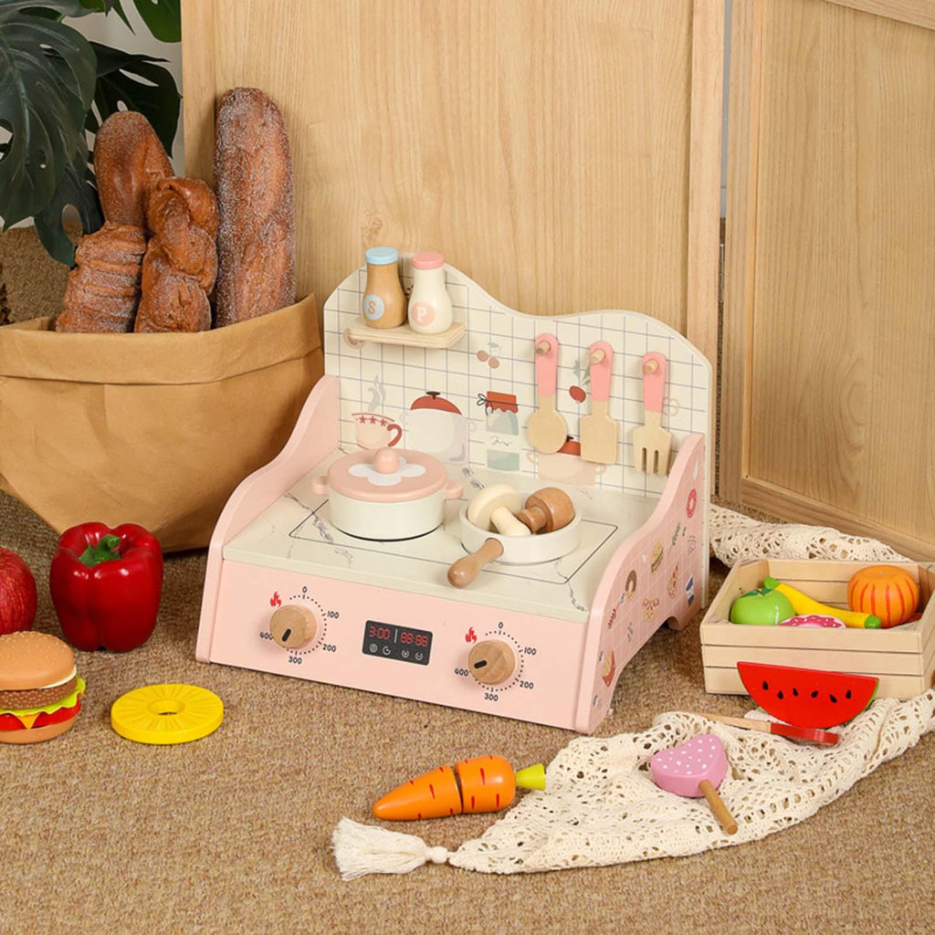 【Realistic Design and Functionality】: Kitchen Playset Toy includes a lifelike stove with a rotating knob, cutlery hooks, and wooden pots and pans. Exquisite cartoon kitchen patterns enhance children's realistic cooking experience