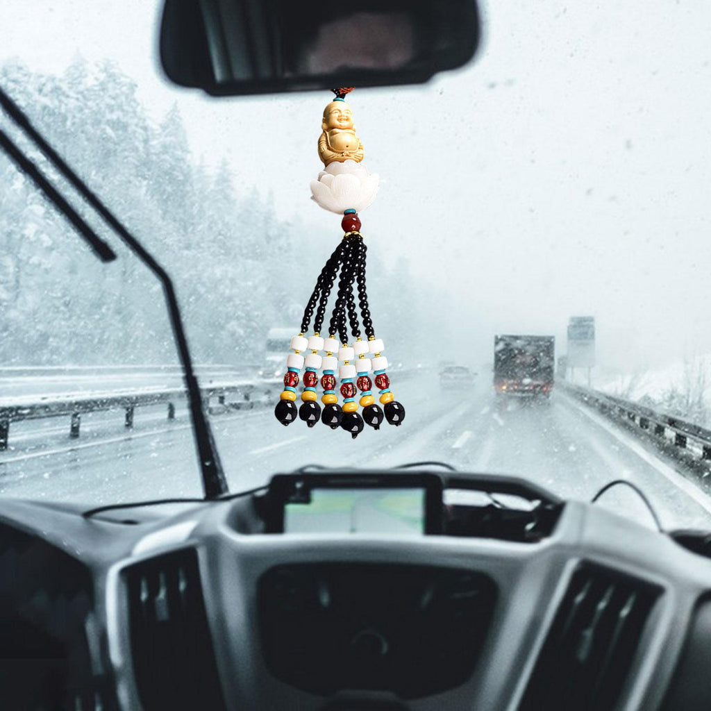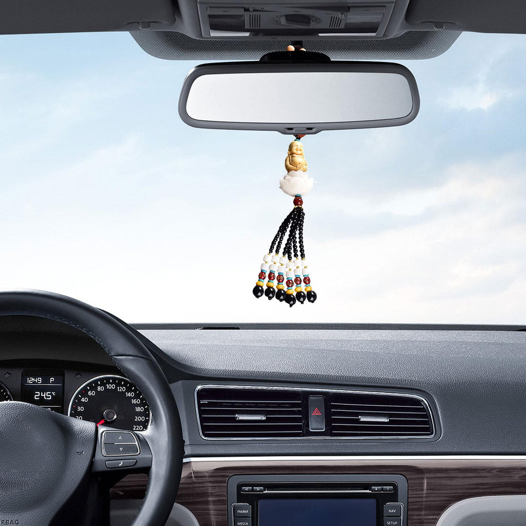 【Auto Interior Dangle】: Delicate beaded car rearview mirror pendant, decorated with a lotus bead and small figurine pendant, excellent and beautiful.