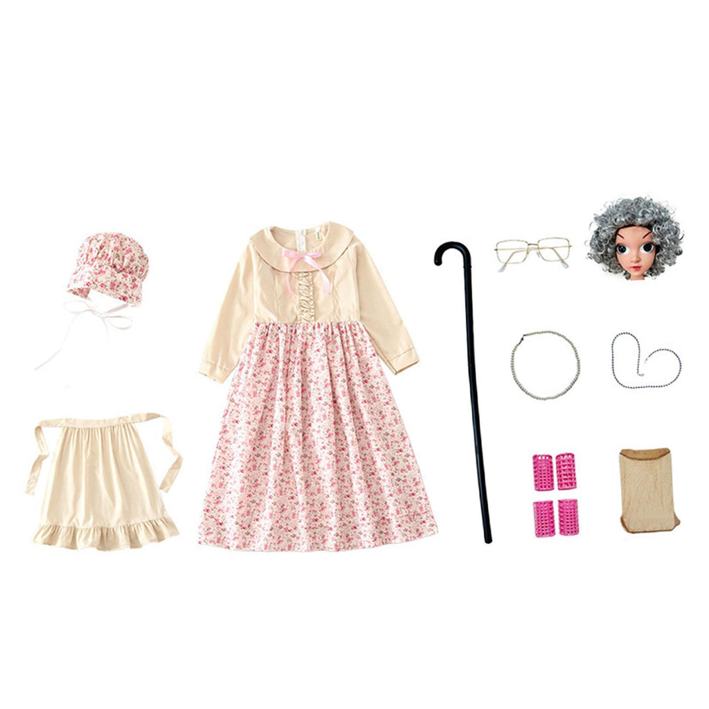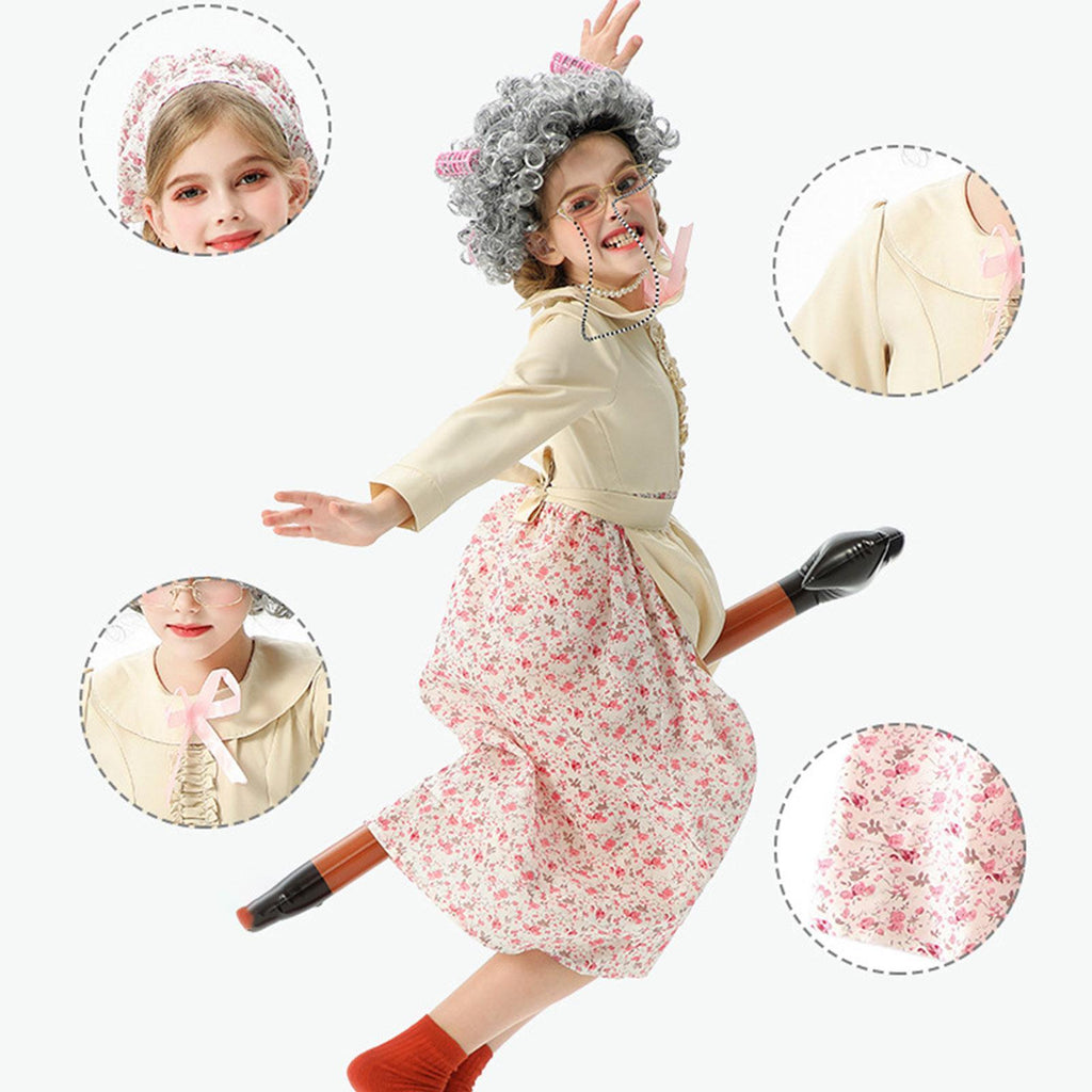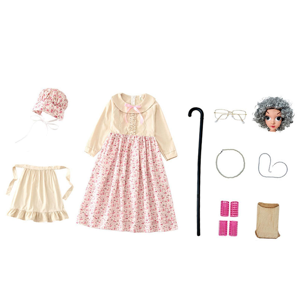 【Complete Grandma Costume for Girls】: These set features a realistic grandma wig, a 1920s dress, cardigan, apron, granny glasses, necklace, and cane. It's great for transforming into an adorable grandma during the 100th day of school celebrations or Halloween