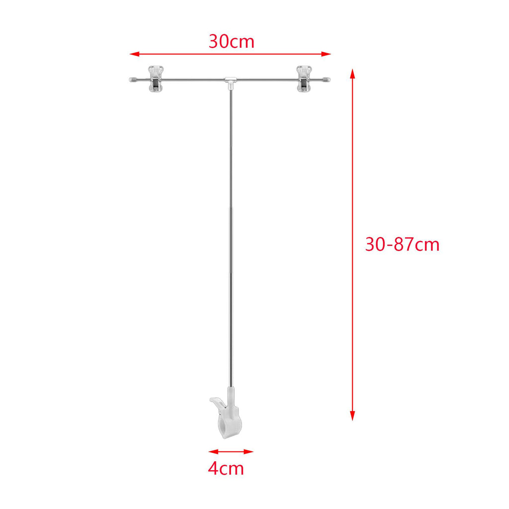 Product Size: The crossbar length is 30cm/11.81inch, the height retractable 30cm-87cm/11.81inch-34.25inch, and the clip is open 4cm/1.57inch.