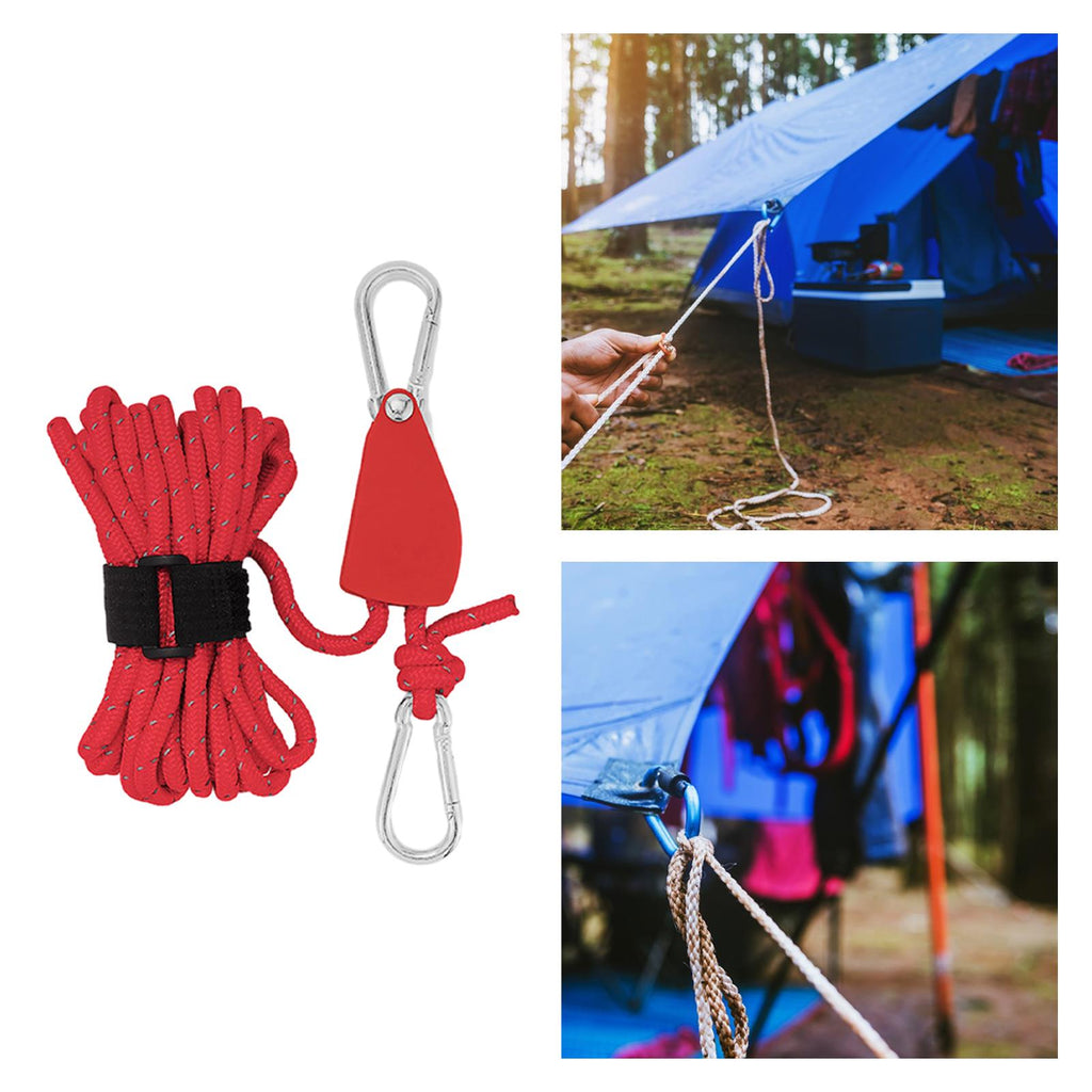 【Pulley Design】: The camping windproof rope adopts a pulley design with tension adjustment, which can be firmly fixed by just pulling, helping to secure your camping tent or awning.
