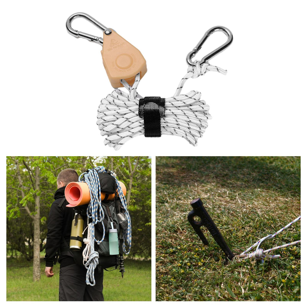 【Pulley Design】: The camping windproof rope adopts a pulley design with tension adjustment, which can be firmly fixed by just pulling, helping to secure your camping tent or awning.