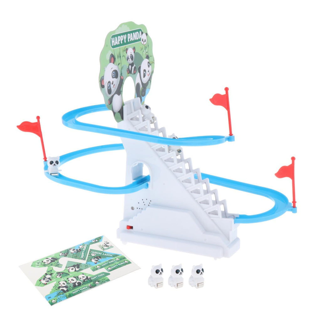 【Flash Light and Music】: Electric track slide toys comes with flash light and cheerful music, and these panda climbing stairs with the music, and then slide down the slide.