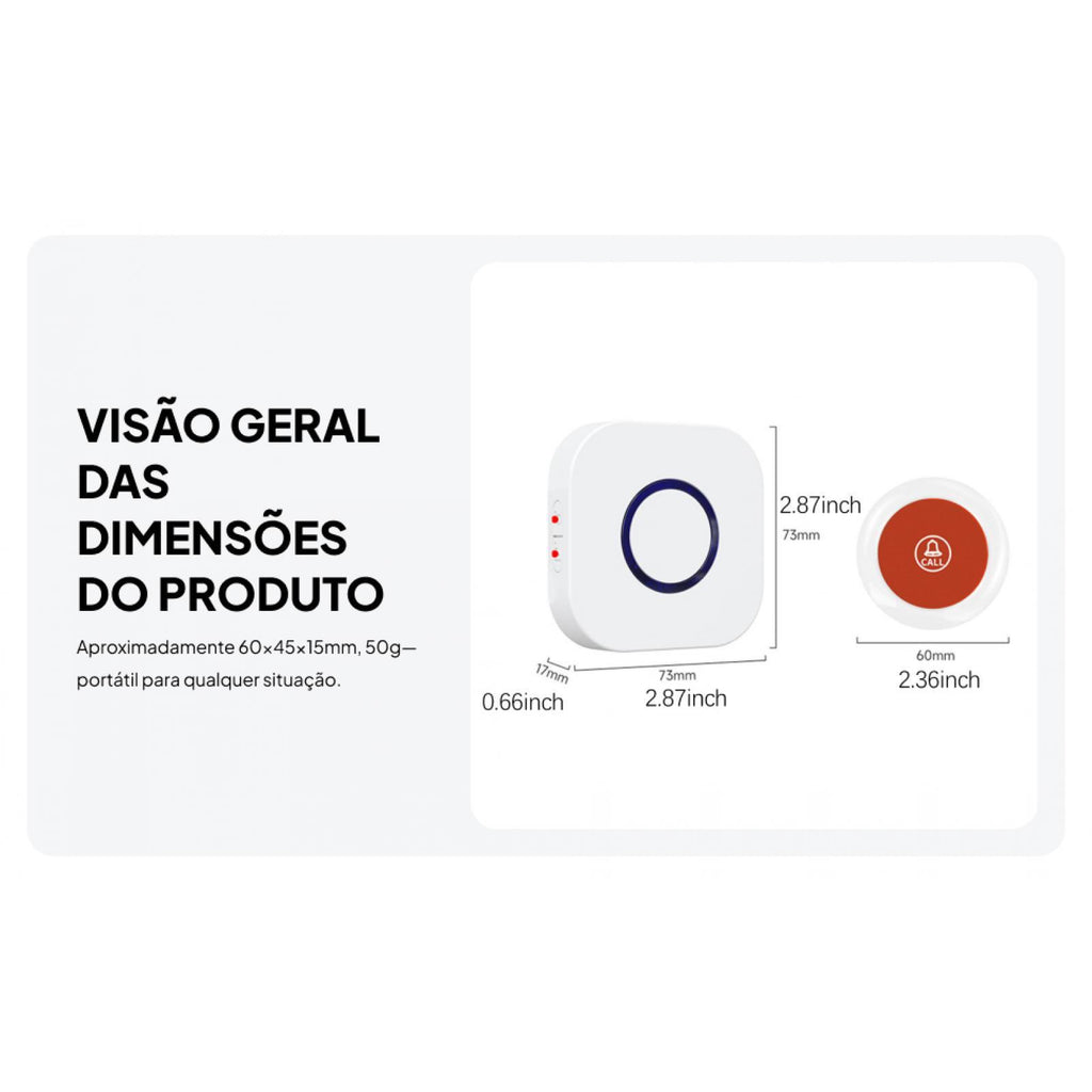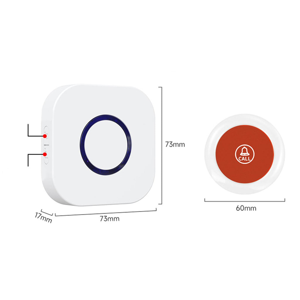 - 【Portable Alarm Call Bell Dimensions】: The main receiver measures 7.3cmx7.3cmx1.7cm/2.87inchx2.87inchx0.67inchmm while the call button measures 6cmx6cmx1.4cm/2.36inchx2.36inchx0.55inch - compact enough to be carried around easily without being obtrusive.