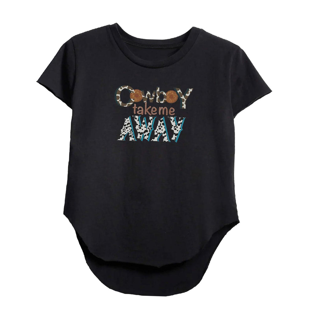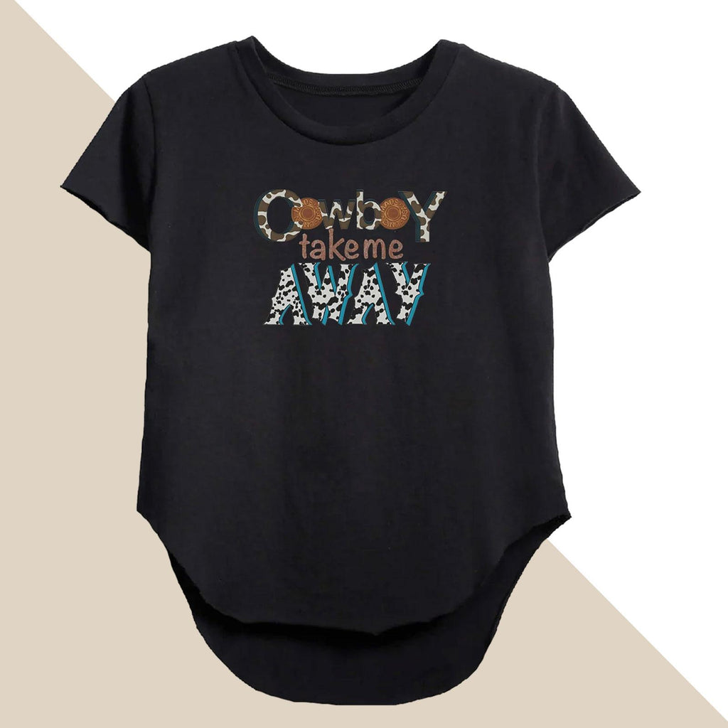 【Versatile Match】: Short sleeved T shirt with round neck design, "cowboy take me away" letters printed, curved hem, and tunic design, can be easily paired with your favorite jeans or shorts to create a chic look.