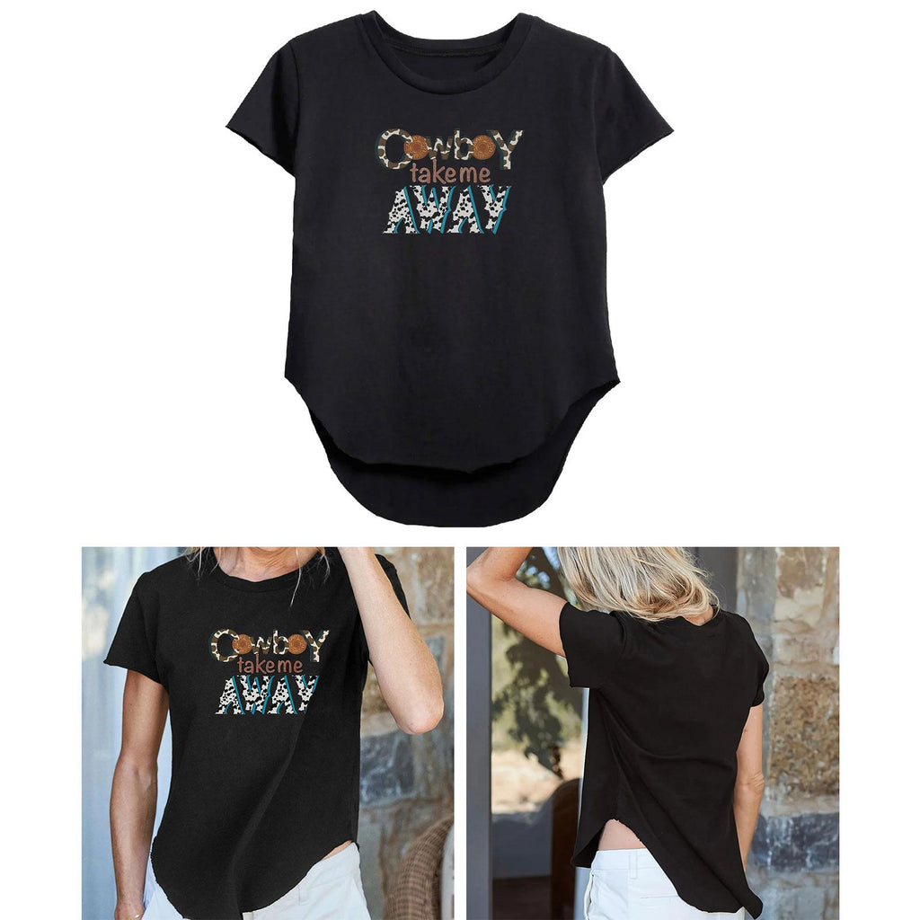 【Versatile Match】: Short sleeved T shirt with round neck design, "cowboy take me away" letters printed, curved hem, and tunic design, can be easily paired with your favorite jeans or shorts to create a chic look.